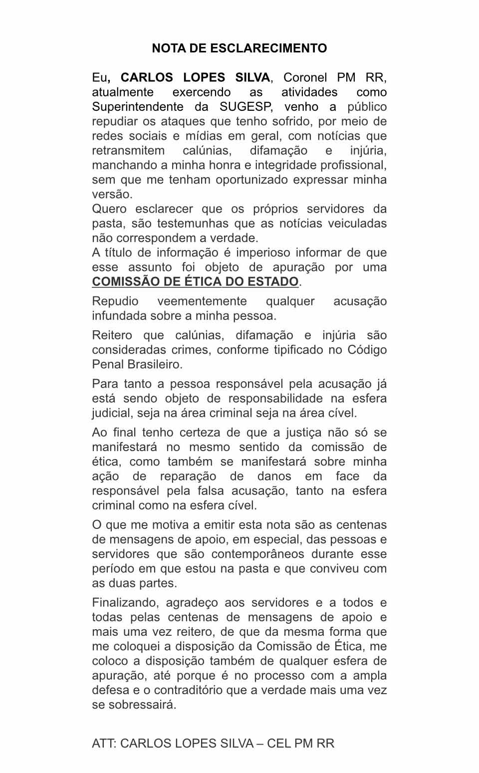 Nota de Esclarecimento - Coronel PM Carlos Lopes Silva