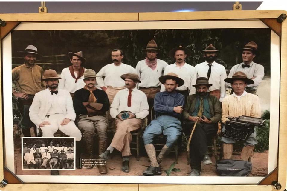 Equipe de trabalhadores da construção da ferrovia Madeira-Mamoré, com dois engenheiros-fiscais brasileiros. À direita, sentado e com uma máquina de escrever ao colo, o engenheiro (EUA) Frank Kravigny, autor do livro “The Jungle Route” e redator do jornal “Marconigram”, cujo dístico de apresentação, em espanhol lembrava que “A vida sem literatura e quinina é morte” - “Marconigram” foi o segundo jornal publicado nas oficinas da Madeira-Mamoré, o primeiro foi “The Porto Velho Times”. (F. Dana Merril)