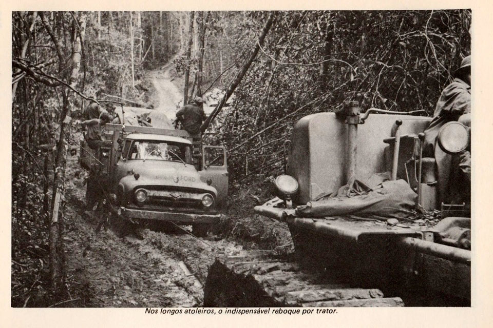 Há 61 anos, na noite de 28 de dezembro, praticamente toda a população de Porto Velho, em torno de 52 mil moradores, fez festa, para receber a “Caravana Ford”, um grupo de caminhões e outros veículos saídos de São Paulo há exatos dois meses, a primeira comitiva de carros a vencer a rodovia BR-029 (364), então apenas um traço aberto na selva amazônica. Uma viagem só possível pela disposição do governador Paulo Leal que designou um grupo de funcionários do Território para trazer os veículos – vieram também dois carros particulares e uma viatura adquirida pelo governo do Acre. Uma viagem muito difícil com os caravaneiros contando em alguns trechos com o apoio das empresas que ainda trabalhavam na abertura da estrada, cujos tratores arrastavam (foto) os caminhões nos atoleiros, especialmente no trecho Pimenta Bueno a Jaru. Um dos caravaneiros, o mecânico Gervásio, mantém em sua casa no Bairro Arigolândia um painel com dezenas de fotos da viagem.
