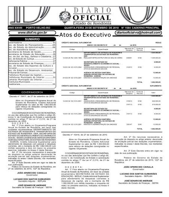 Nove dias após deixar a condição de Território Federal, a 22 de dezembro de 1981, e quatro dias antes de sua instalação oficial, o Estado de Rondônia, teve impresso seu primeiro Diário Oficial, no dia 31 dezembro, quando foi criada a Imprensa Oficial, cujo primeiro diretor foi o jornalista Sebastião Sílvio de Castro Leite. A edição feita na Imprensa Oficial do Estado de São Paulo. A primeira página foi uma “Mensagem ao Povo Rondoniense”, assinada pelo governador Jorge Teixeira, destacando que “O Estado de Rondônia será o que formos capazes – governantes, governados, irmanados – de fazer dele, lembrando “a fé inabalável de que a vontade da sociedade unida é capaz de vencer os obstáculos mais difíceis”. Essa primeira edição contava 96 páginas, inseria a Lei Complementar 41 (que criou o Estado) e o Decreto número 1 que “Dispõe sobre a organização do Poder Executivo do Estado de Rondônia e dá outras providências”.