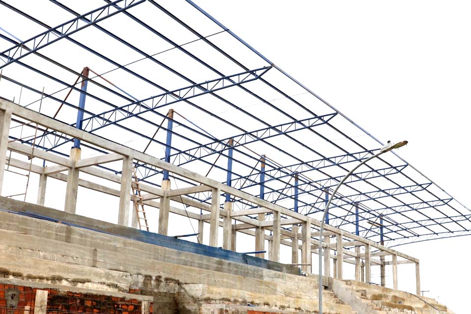Toda estrutura metálica da cobertura da arquibancada já está sendo montada, em breve essa parte da obra estará concluída.