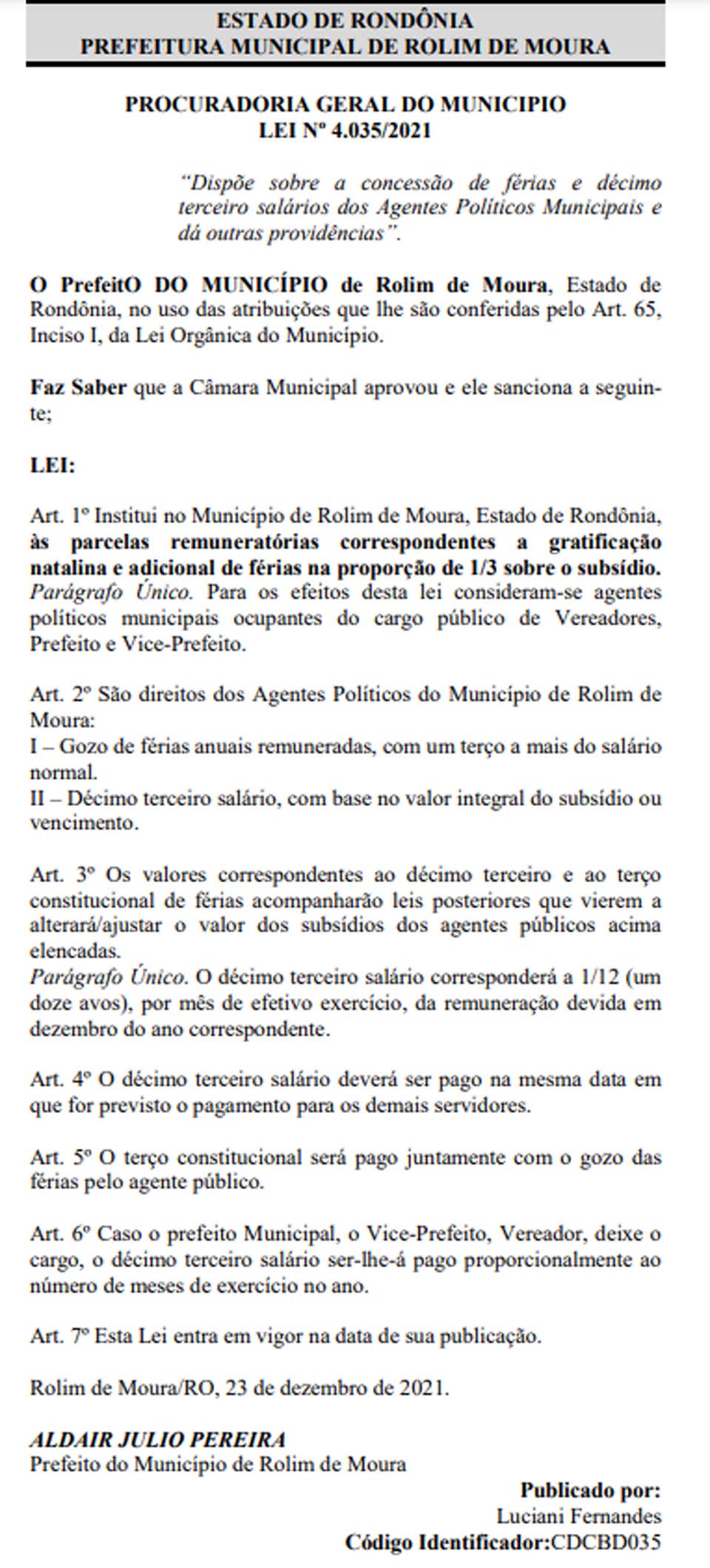 Porto Velho, RO – O prefeito do Município de Rolim de Moura Aldair Júlio Pereira, do MDB, sancionou lei que dispõe sobre a concessão de férias e décimo terceiro salário a agentes políticos.