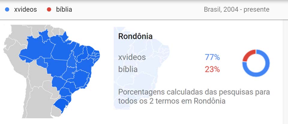 Em análise de tópicos mais buscados no Google por interesses por estes dois tópicos dicotônicos. A busca por site adulto Xvideos é superior (+80%) em todos os estados em todo o país, comparando com busca pela Bíblia, biblia online ou mensagens bíblicas.(<22%), de 2004 a 2021.