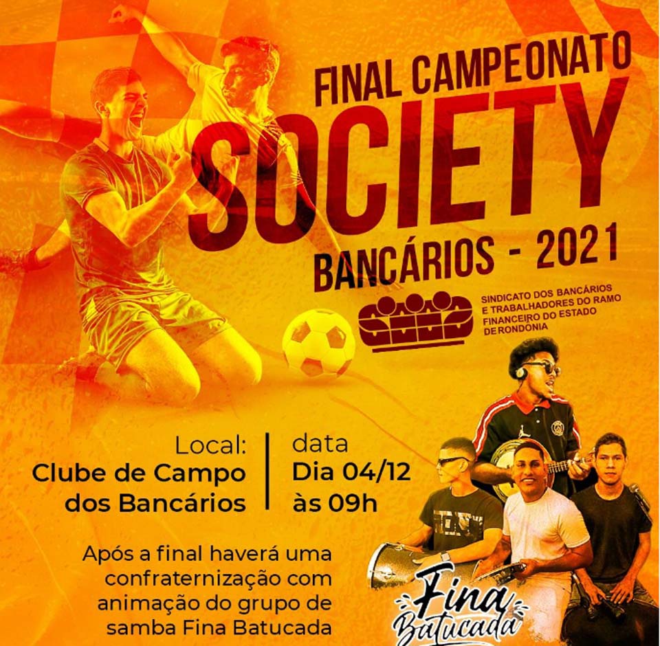 A grande final do 25º Campeonato de Futebol Society dos Bancários entre os times do Banco do Brasil e União de Bancos acontece neste sábado (4/12), a partir das 9 horas, e o Sindicato dos Bancários e Trabalhadores do Ramo Financeiro de Rondônia (SEEB-RO) convida a todos os bancários e cooperativários (filiados) a participarem desta grande celebração do desporto e da confraternização da categoria.