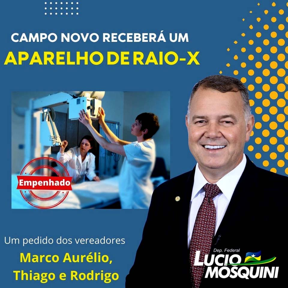 Campo Novo;RO - O deputado Federal Lucio Mosquini (MDB-RO), na última segunda-feira (10), anunciou a destinação de um aparelho de Raio-X, para a Saúde do município de Campo Novo de Rondônia. De acordo com o parlamentar já está assegurado o empenho para a aquisição do equipamento, que em breve será entregue à prefeitura do município.