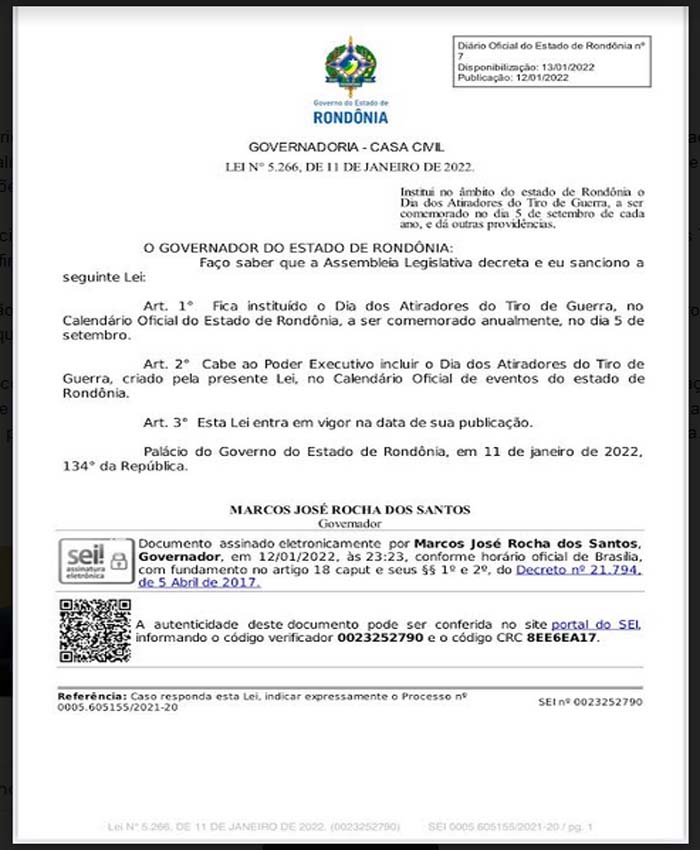 “Esses jovens, ao serem matriculados com base na Lei do Serviço Militar, recebem a denominação de “atiradores”, designação emblemática e histórica, oriunda das primeiras sociedades de Tiro ao Alvo no Brasil, com finalidades militares e de formação da reserva para o Exército, embrionárias dos atuais Tiros de Guerra. Os atiradores têm uma importância relevante em nossa sociedade e merecem, além do nosso respeito e admiração, um dia para que sejam lembrados e homenageados”, finalizou o deputado Anderson Pereira.