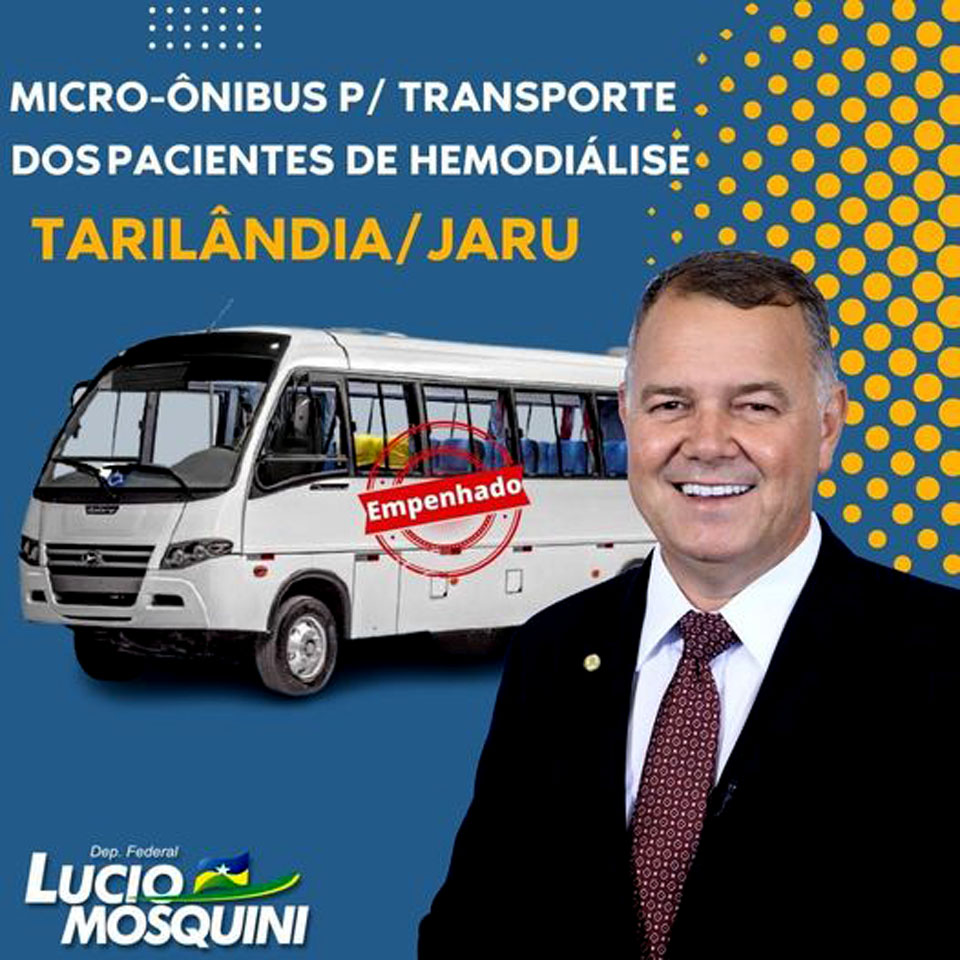 Jaru; RO - O Deputado Federal Lucio Mosquini (MDB-RO), anunciou nesta terça-feira (4), a destinação de um veículo micro-ônibus que irá atender os pacientes de hemodiálise da região de Tarilândia, localizado no Distrito de Jaru. De acordo com o parlamentar o veículo será entregue em breve à prefeitura de Jaru.