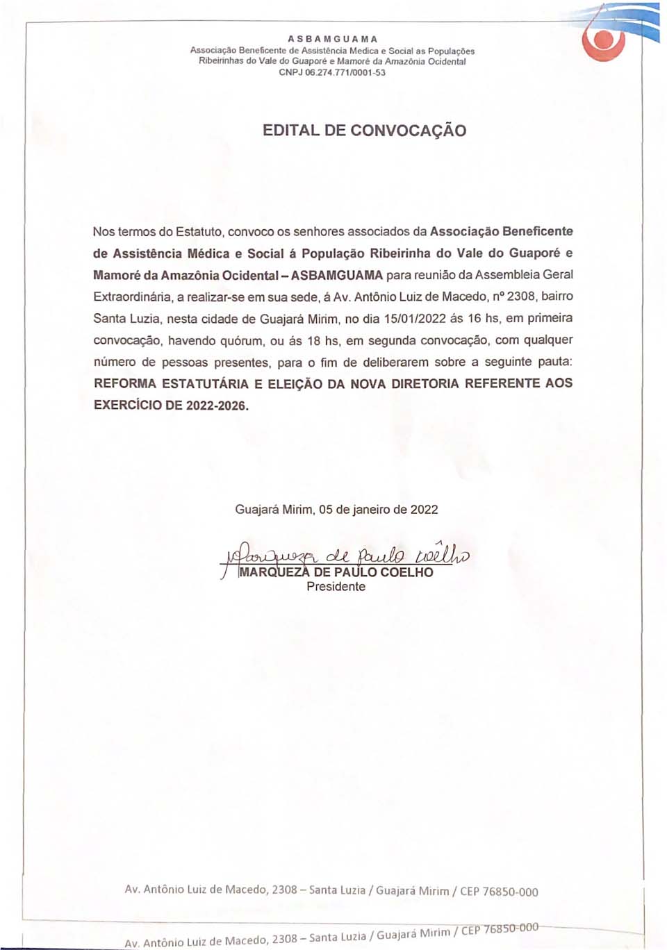 Edital de Convocação da Associação Beneficente de Assistência Médica e Social as Populações Ribeirinhas do Vale do Guaporé e Mamoré da Amazônia Ocidental - ASBAMGUAMA
