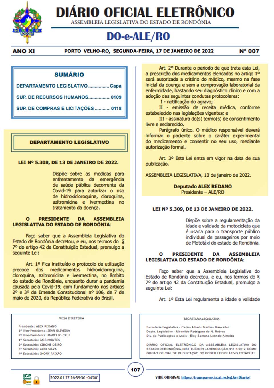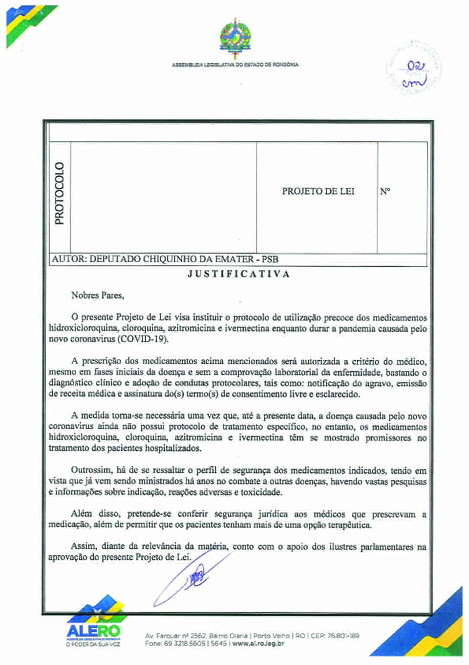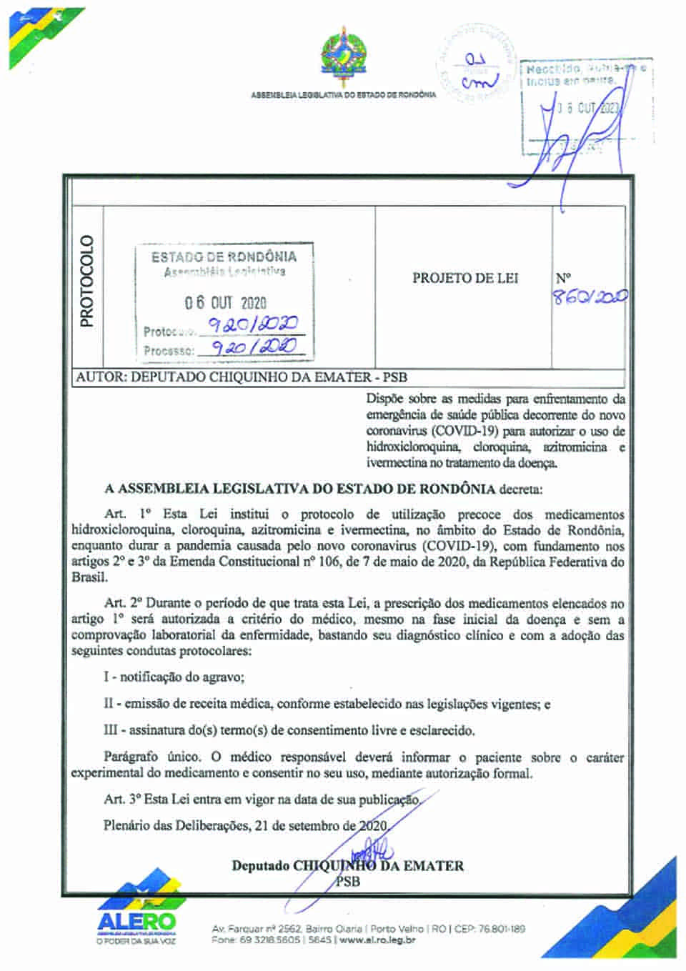 Porto Velho, RO – Saiu no Diário Oficial da Assembleia de Rondônia (ALE/RO): agora é lei estadual a autorização do uso de fármacos como hidroxicloroquina, cloroquina, azitromicina e ivermectina contra o Coronavírus (COVID-19/SARS-CoV-2).