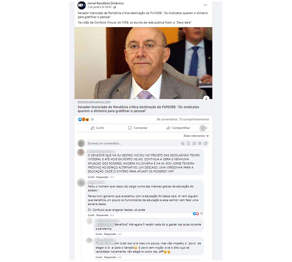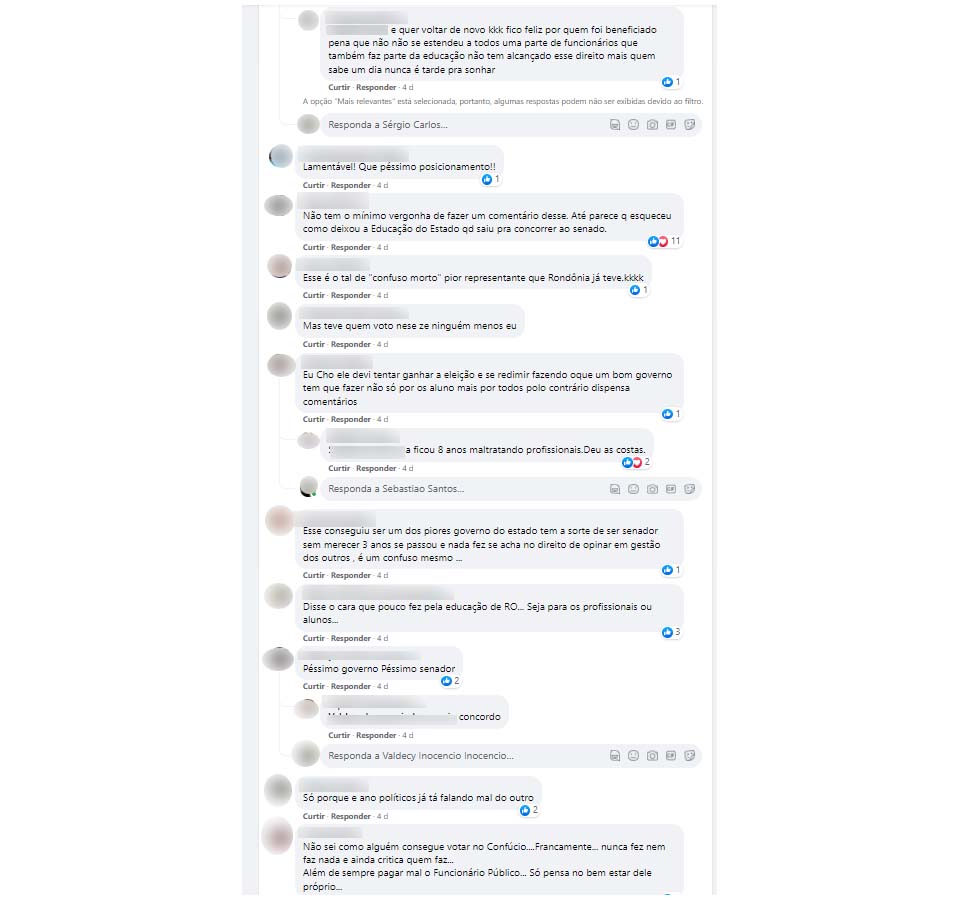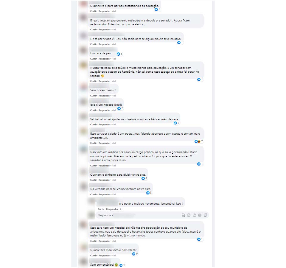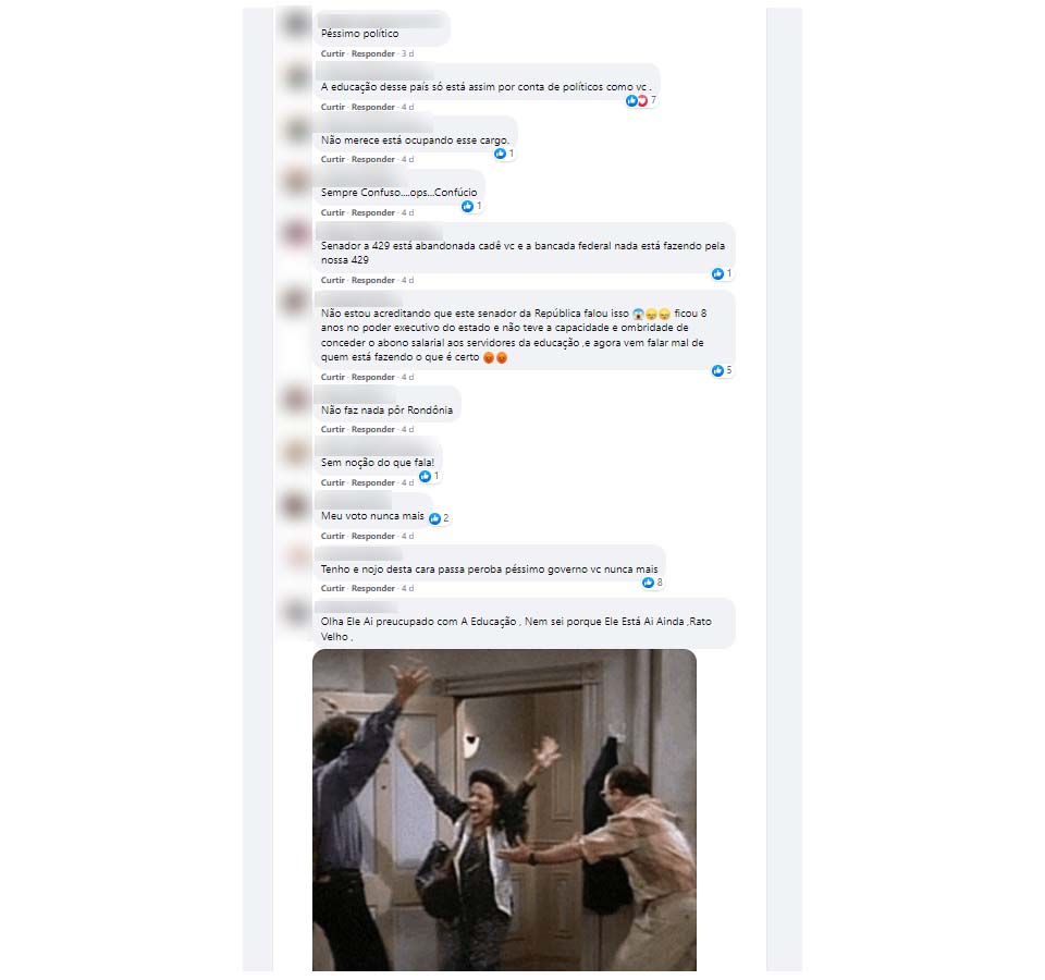 Na postagem original da matéria na página oficial do Rondônia Dinâmica no Facebook, o feedback foi massivamente negativo, cem por cento, no caso.