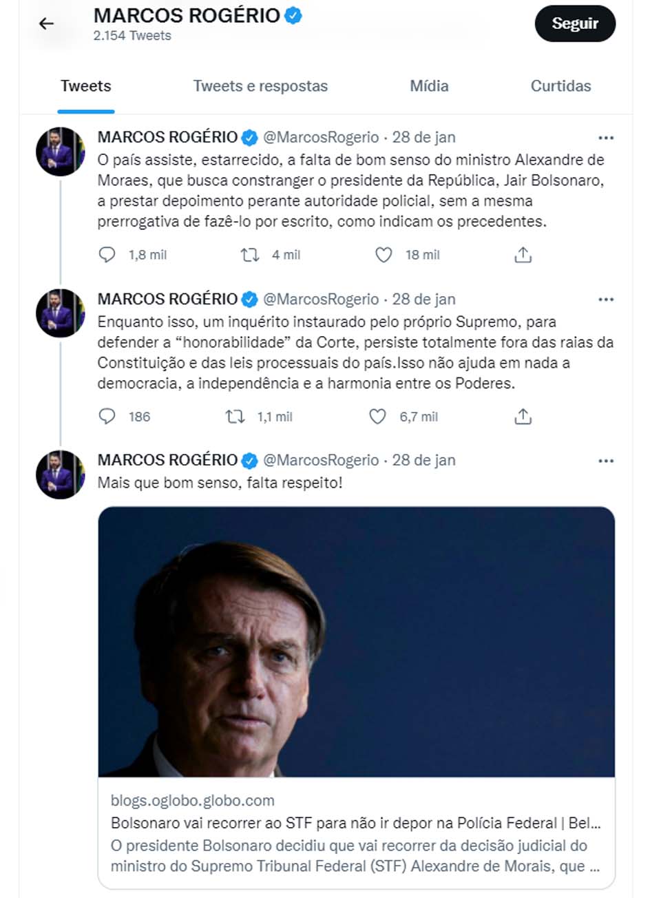 “O país assiste, estarrecido, a falta de bom senso do ministro Alexandre de Moraes, que busca constranger o presidente da República, Jair Bolsonaro, a prestar depoimento perante autoridade policial, sem a mesma prerrogativa de fazê-lo por escrito, como indicam os precedentes”, finalizou.
