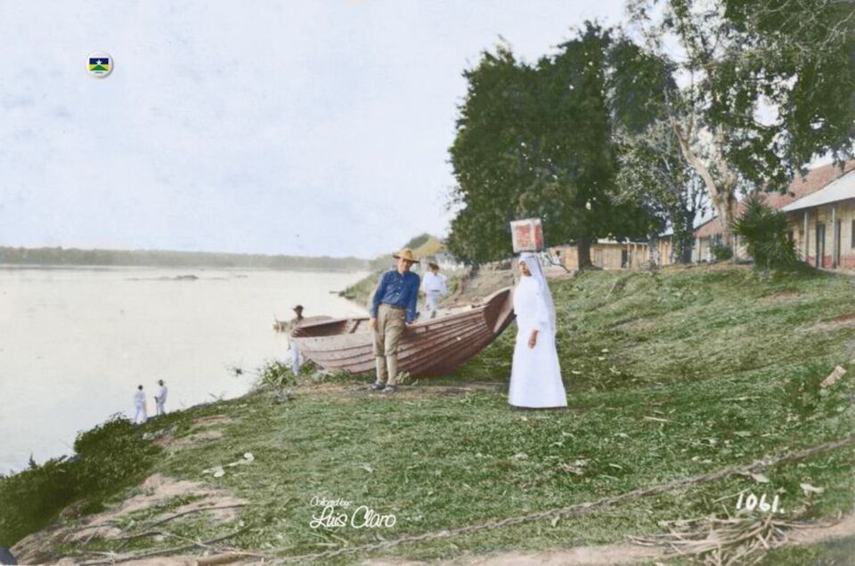 Entre 1910 e 1912 o fotógrafo estadunidense Danna B. Merril contou, através de milhares de fotografias, a história da construção da Estrada de Ferro Madeira-Mamoré. Nessa ele está encostado numa canoa, bem à vontade, tendo como pano de fundo o Rio Mamoré, e à esquerda o consulado brasileiro em Vila Bela (Bolívia), onde a ferrovia deveria ter terminado. Vila Bela tinha como cidade próxima no lado brasileiro Vila Murtinho, que na década de 1980 praticamente deixou de existir com a transferência de moradores e administração para a margem da rodovia BR-425, onde se formou inicialmente o município de Nova Mamoré (antes denominado “Boca”, “Vila”, “Vila Nova” e “Vila Nova do Mamoré” - https://cidades.ibge.gov.br/brasil/ro/nova-mamore/historico). A mulher que passa em frente a Dana, com uma lata d’água na cabeça, parece ser uma freir, mas, conforme |Luiz Claro, que colorizou a foto, trata-se de uma índia de etnia local. (F. acervo rondoniaminhaqueridarondonia)