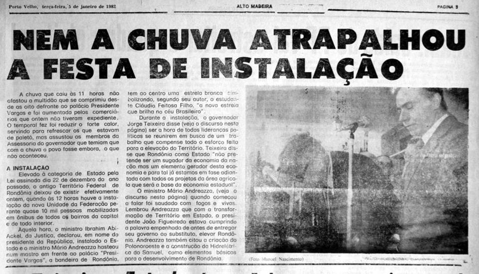 Com caravanas de vários estados e de todos os municípios – eram 13 até então, e chuva (como registrou em sua edição do dia seguinte o Jornal Alto Madeira – foto), o ministro da Justiça Ibrahim Abi-Ackel, representando o presidente João Figueiredo (o ministro do Interior Mário Andreazza também estava presente), e muita emoção do governador Jorge Teixeira, foi instalado no dia 4 de janeiro de 1982, uma segunda-feira, o Estado de Rondônia, o primeiro dos territórios Federais criados em 1943 a alçar à condição de Unidade da Federação. Conforme a Lei Complementar 41/1981 a 23ª Estrela no “Azul da União”, nascia apenas com um poder designado, o Executivo, dando ao governador Jorge Teixeira meios para criar outros órgãos da estrutura normal do Estado (Judiciário, Ministério Público, Tribunal de Contas). O Poder Legislativo foi instalado apenas em 6 de agosto de 1983 quando promulgada a Constituição Estadual.