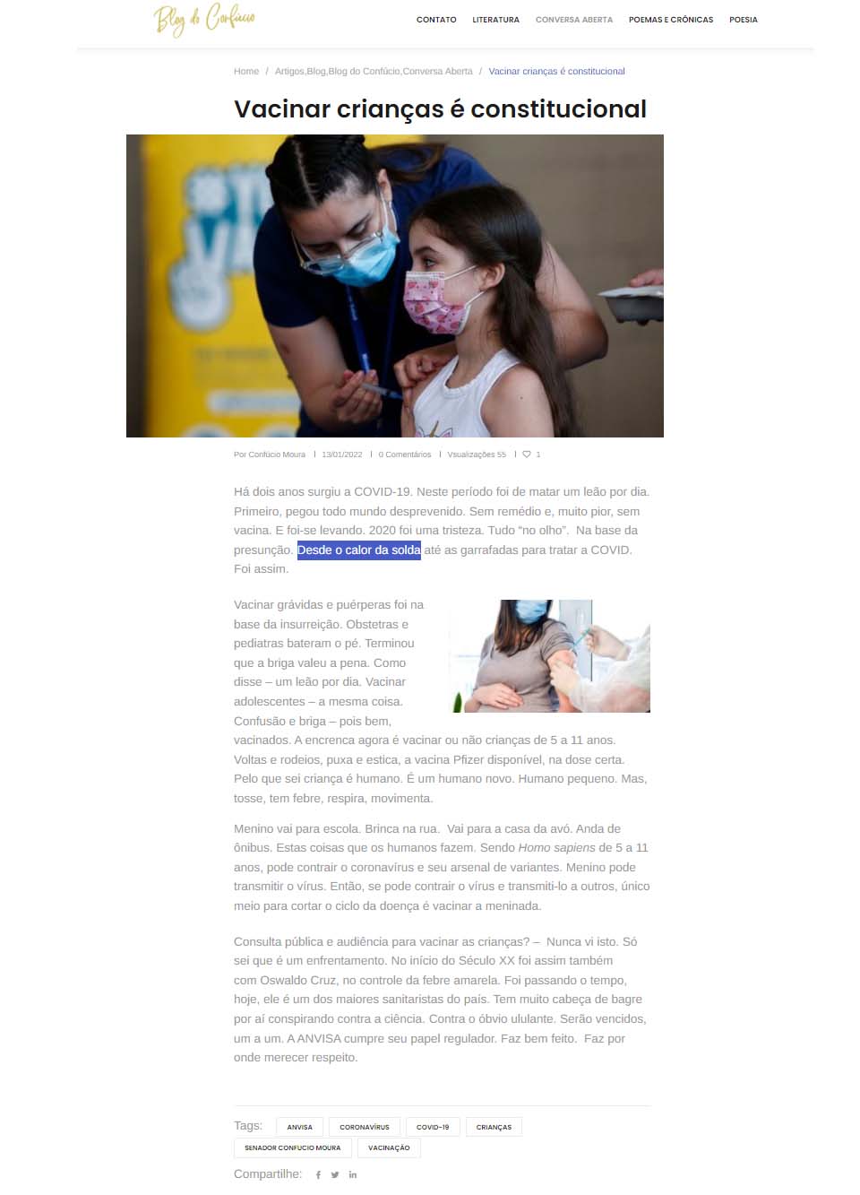 Porto Velho, RO – O senador de Rondônia Confúcio Moura, do MDB, ora licenciado, veiculou um texto em seu blog homônimo defendendo a vacinação de crianças contra o Coronavírus (COVID-19/SARS-CoV-2).