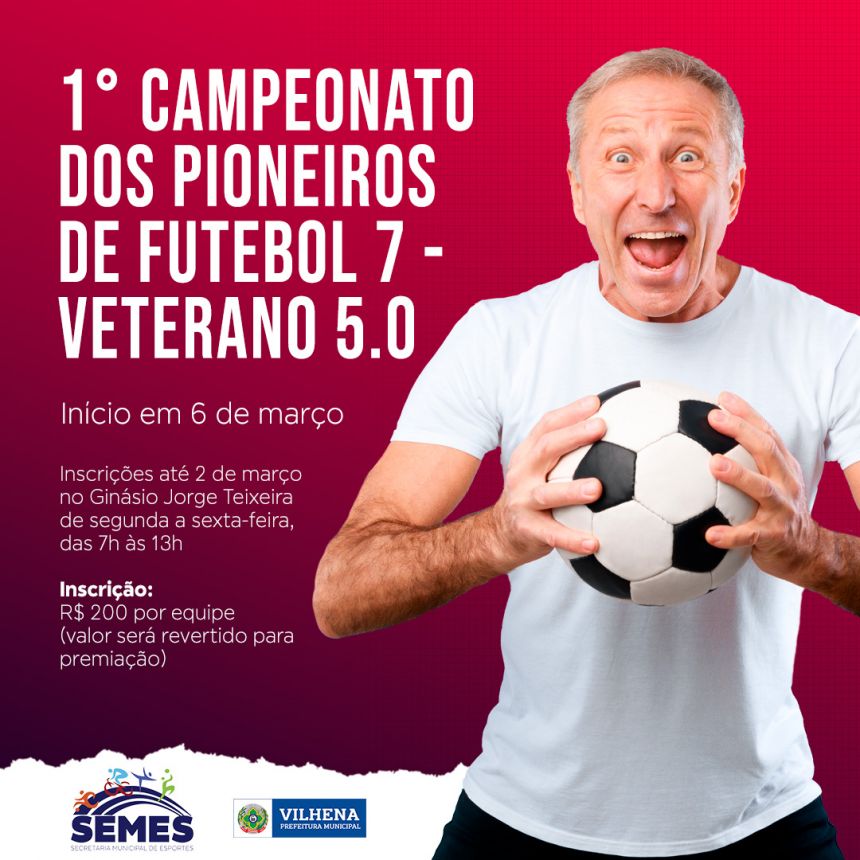 Uma das diversas competições que estão sendo organizadas pela Secretaria Municipal de Esportes (Semes) acontece no próximo dia 6 de março: o 1° Campeonato dos Pioneiros de Futebol 7 de Veteranos 5.0. Planejado para os jogadores com 50 anos ou mais, o evento tem inscrições abertas até o dia 2 de março, no ginásio Jorge Teixeira, sede da secretaria, que funciona de segunda a sexta-feira, das 7h às 13h. Haverá premiação em dinheiro conforme o número de inscritos, contando com parceria da Arena Fut7.
