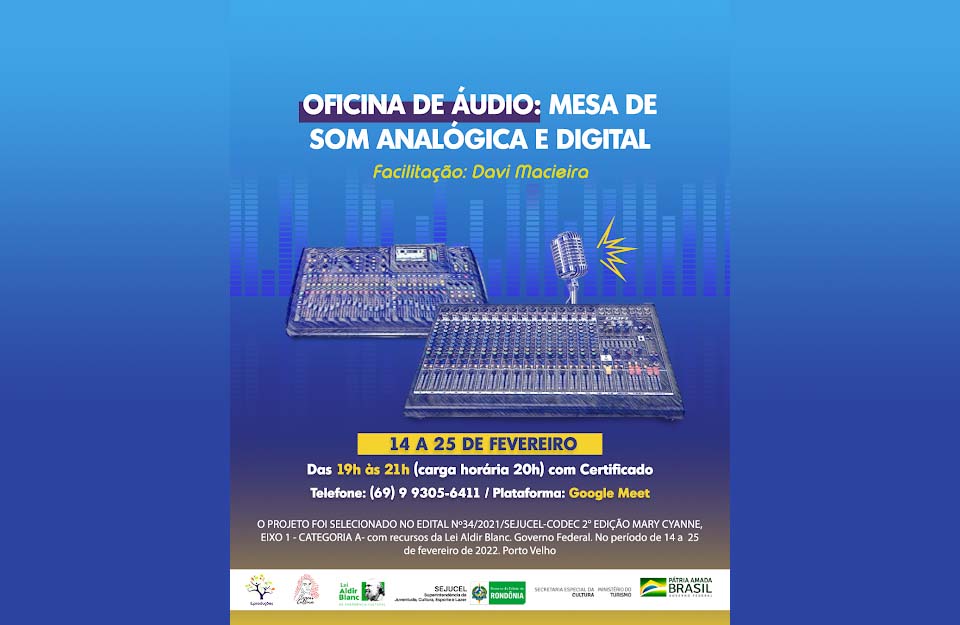 A “Oficina de Áudio: Mesa de som analógica e digital” será realizada online, através de 10 encontros de 02 horas cada, totalizando 20 horas. Os participantes receberão certificado mediante 75% de participação verificados ao final do curso. O público alvo do projeto, são artistas, sonoplastas, produtores e demais interessados, prioritariamente residentes no estado de Rondônia. A oficina objetiva que os participantes possam conhecer os equipamentos e conceitos mais utilizados no áudio de teatros, shows e em estúdios, bem como os efeitos produzidos pelos equipamentos.