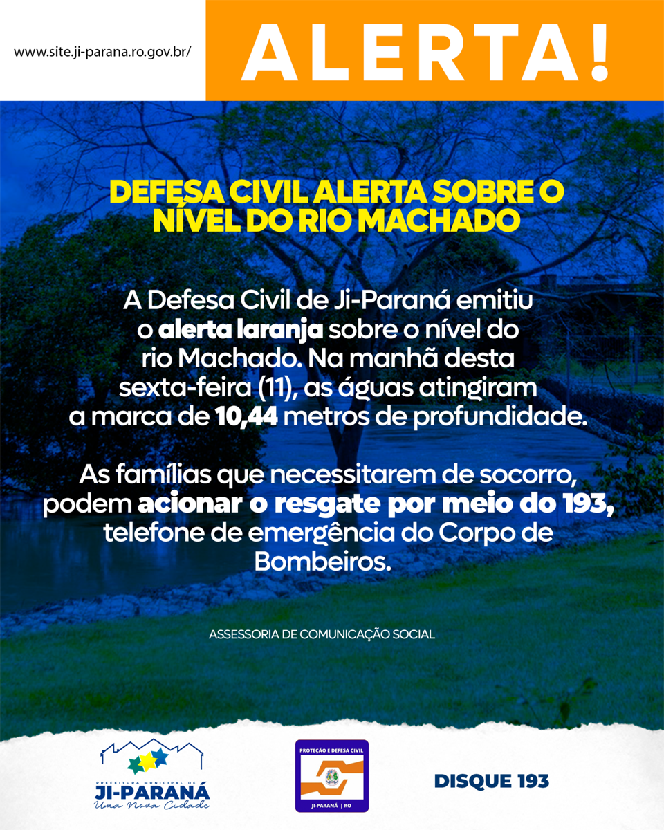 A Defesa Civil de Ji-Paraná emitiu o alerta laranja sobre o nível do rio Machado. Na manhã desta sexta-feira (11), as águas atingiram a marca de 10,44 metros de profundidade, segundo o acompanhamento em tempo real realizado pela Agência Nacional das Águas (ANA).