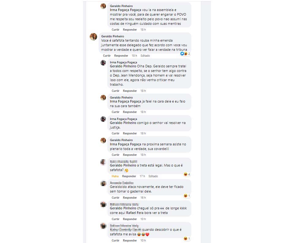 “Voce é safafota tentando rouba minha emenda juntamente esse delegado que fez acordo com voce vou mostrar a verdade e quero ver falar a verdade na tribuna [SIC]”, anotou o parlamentar, ao passo em que uma internauta questiona: