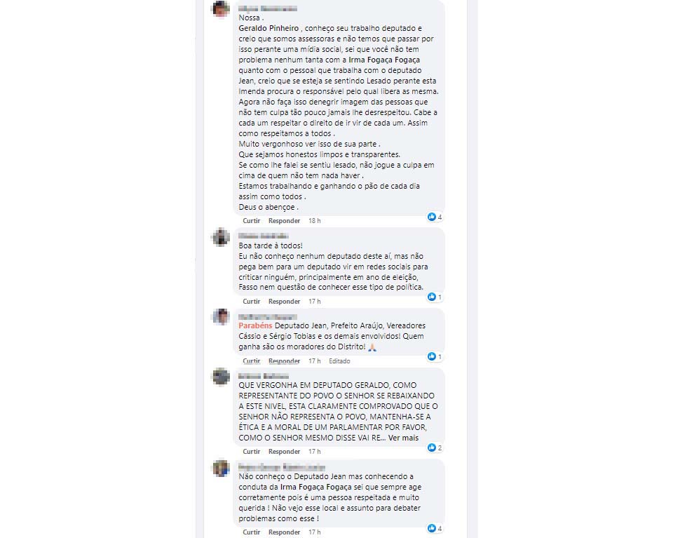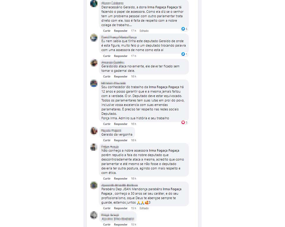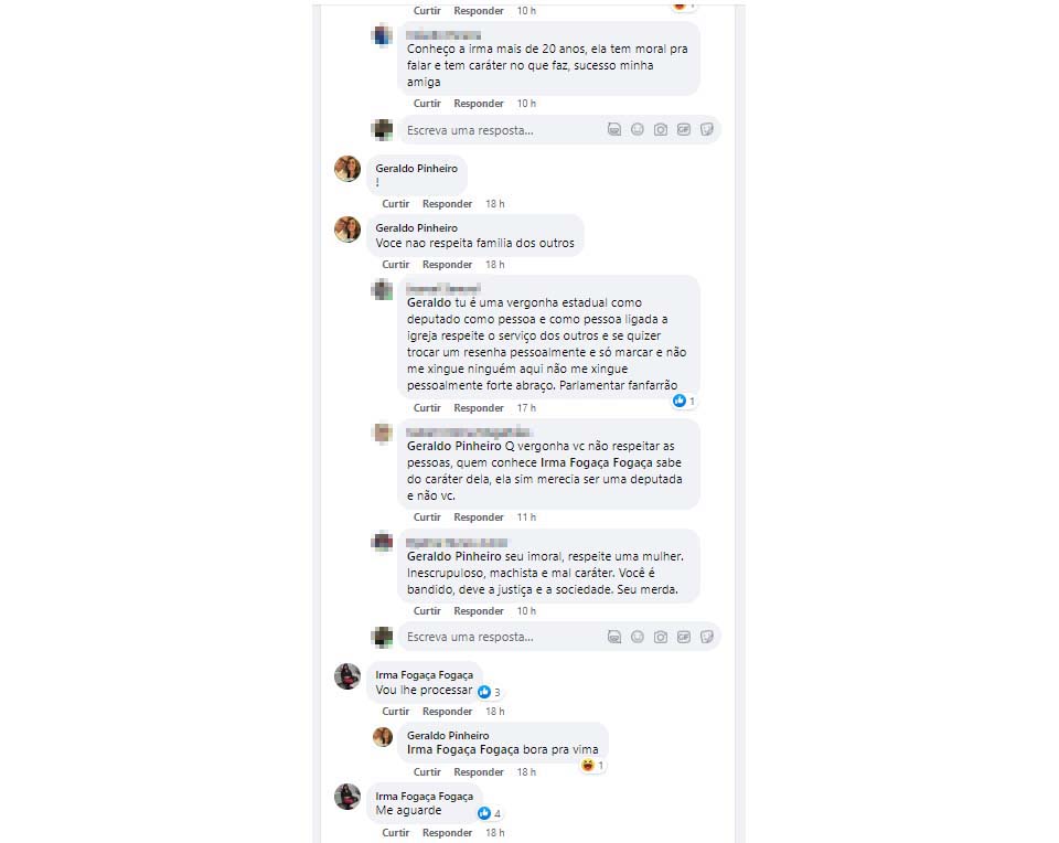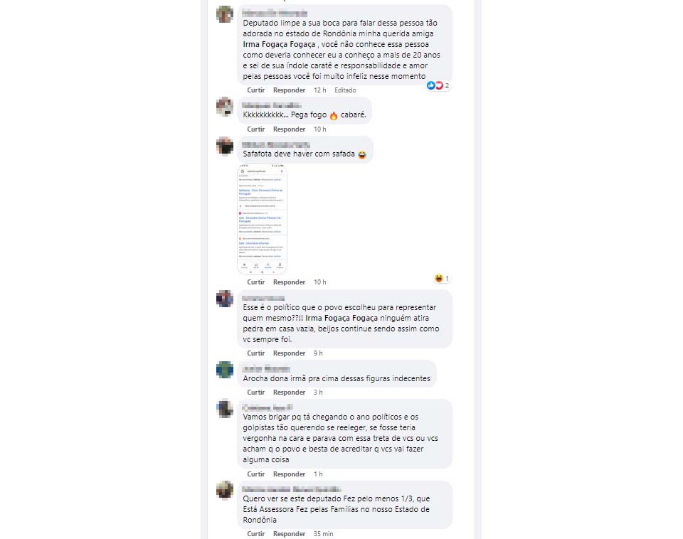E dali iniciou-se uma discussão entre a autora da postagem e o deputado, com envolvimento de terceiros, a maioria defendendo Irma Fogaça e rechaçando veementemente a descompostura do membro da Assembleia Legislativa (ALE/RO).