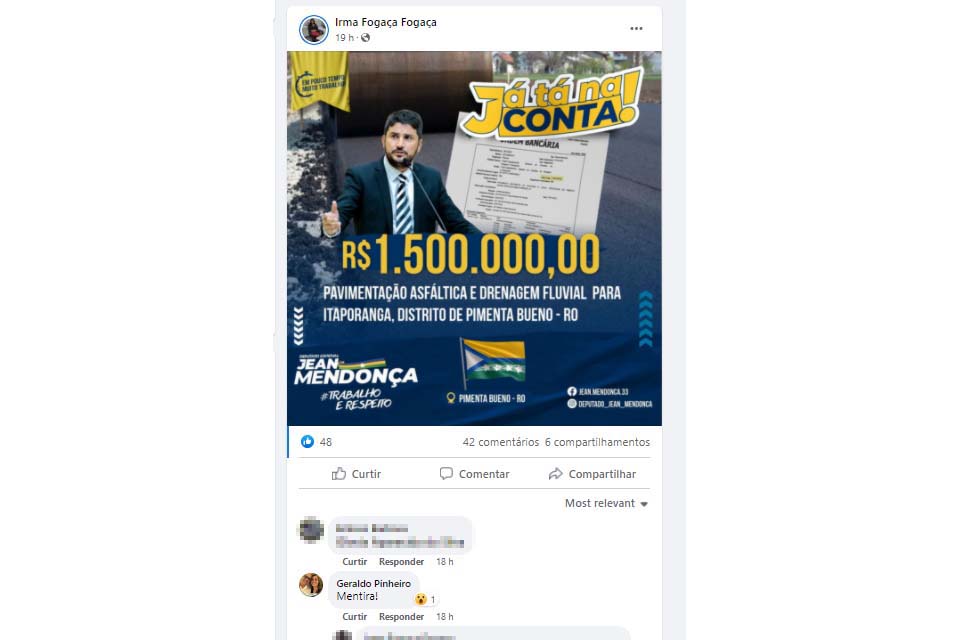 Irma veiculou publicidade em sua página privada no Facebook abordando a liberação milionária de valores na conta do distrito de Itaporanga, pertencente ao Município de Pimenta Bueno.