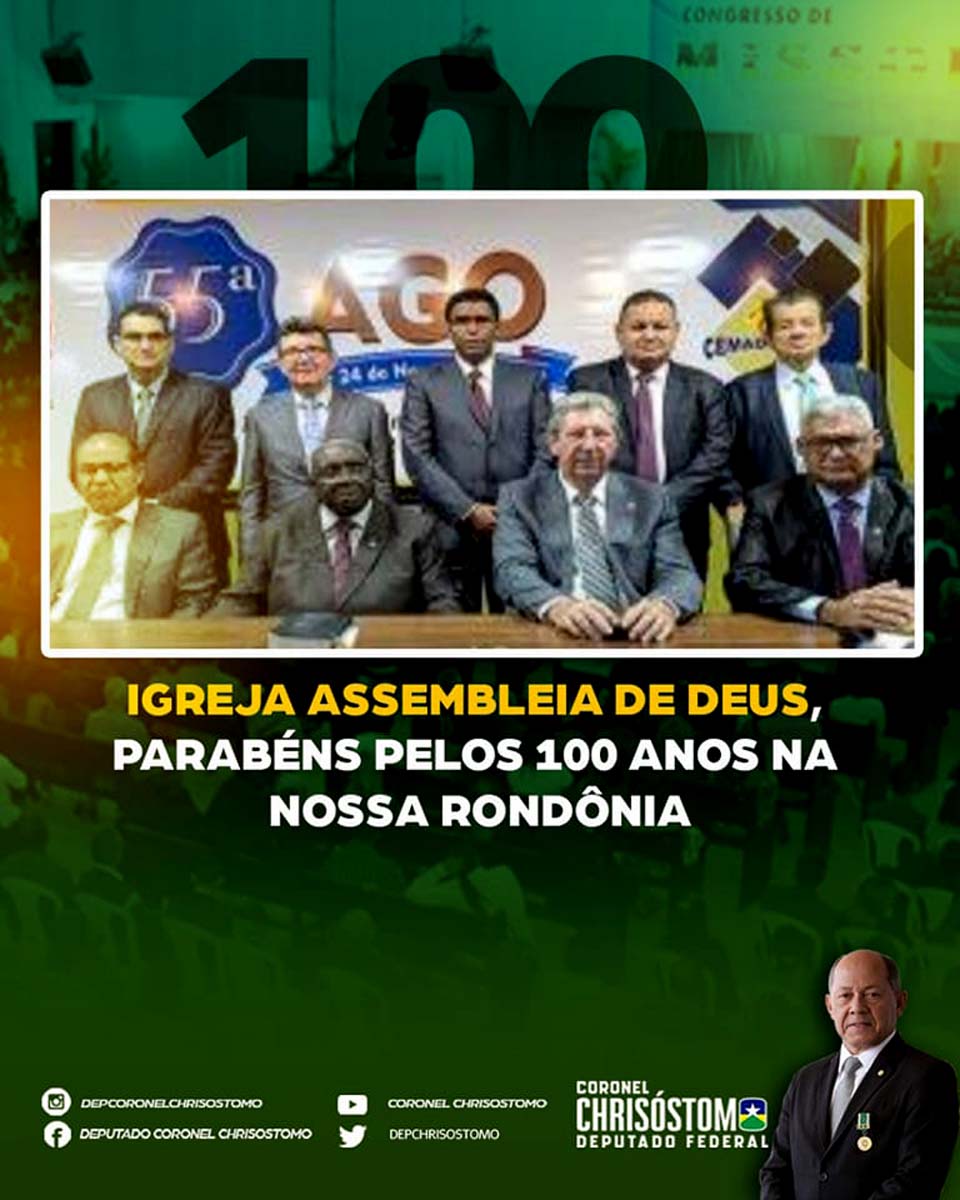 Tenho acompanhado a vida pastoral de muitos missionários da igreja Assembléia de Deus em Rondônia e pela passagem dessa data importante, 100 anos. Quero congratular-me com todos os membros, nas pessoas do Pastor Nelson Luchtenberg, pastor Joel Holder, estendendo a minha Paz do Senhor à todos os membros das Assembléias de Deus.