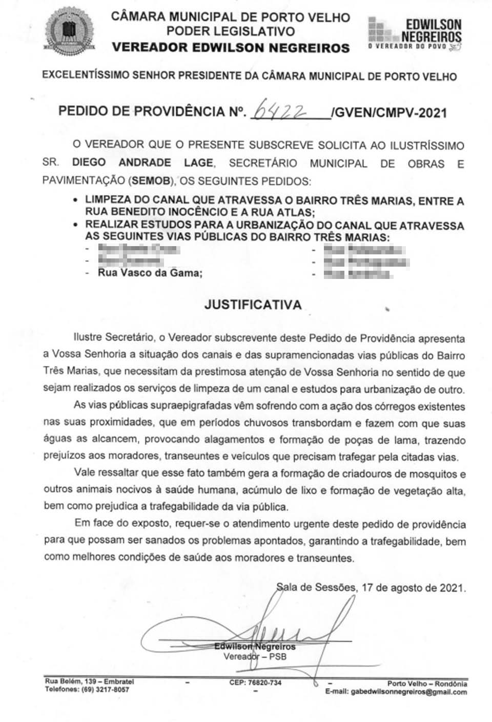 Porto Velho, RO – O Gabinete do vereador Edwilson Negreiros, do PSB, encaminhou Pedido de Providências à Secretaria Municipal de Obras e Pavimentação (SEMOB) solicitando limpeza de um canal situado no Bairro Três Marias, especialmente na Rua Vasco da Gama.