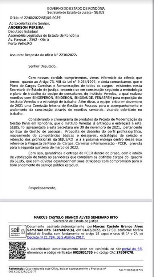 Atendendo uma solicitação do deputado estadual Anderson Pereira (PROS), a Secretaria de Estado de Justiça – Sejus, através do ofício nº 2248/2022/SEJUS-EGPE, direcionando ao pedido do parlamentar, assegurou que o Plano de Cargos, Carreira e Remuneração – PCCR, de toda a categoria está em fase de conclusão e será entregue ainda no primeiro trimestre deste ano.