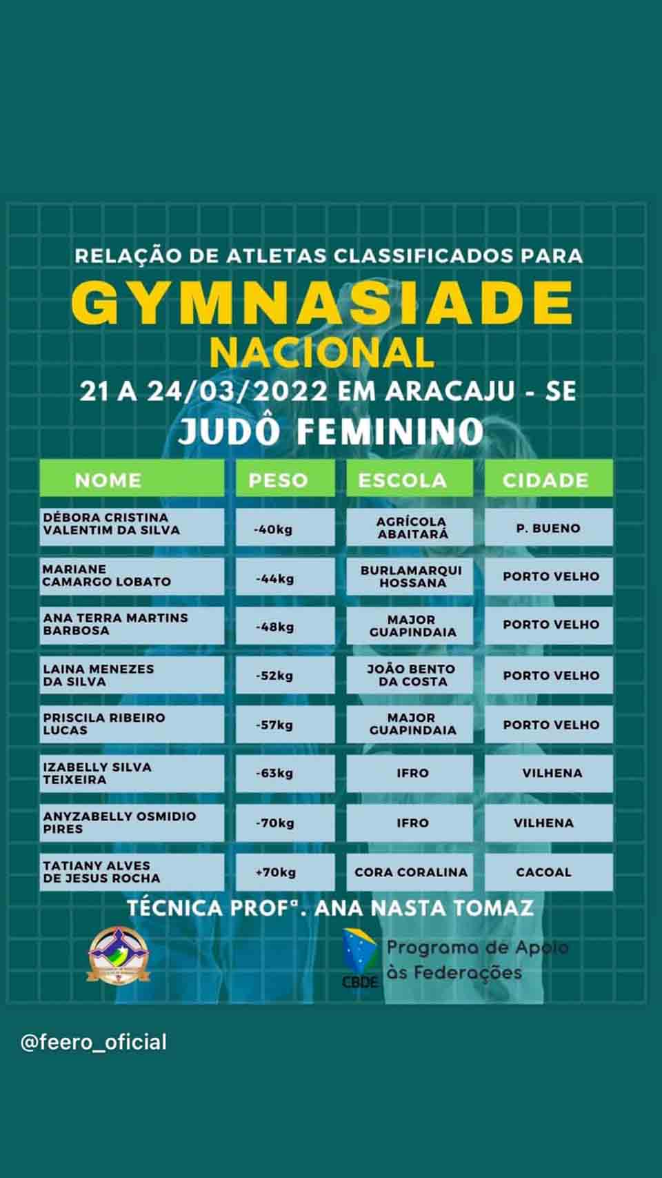 Porto Velho, RO - A judoca rondoniense Laina Menezes, de 15 anos, vai representar Rondônia na Seletiva Nacional Gymnasíade Escolar 2022, que será disputada de 21 a 24 de março de 2022, em Aracaju, capital de Sergipe (SE).