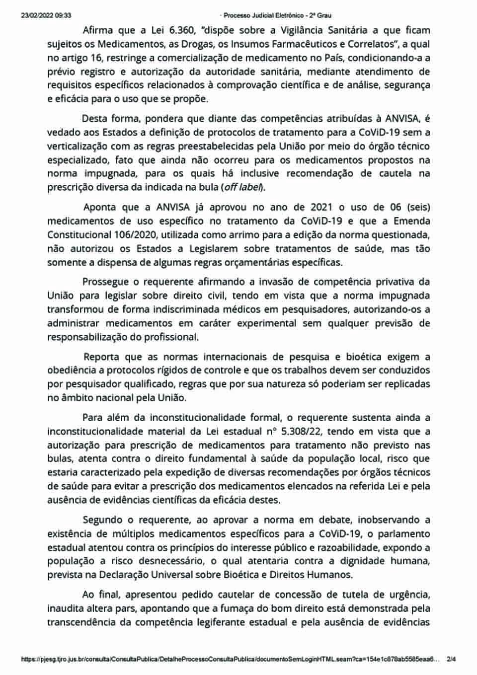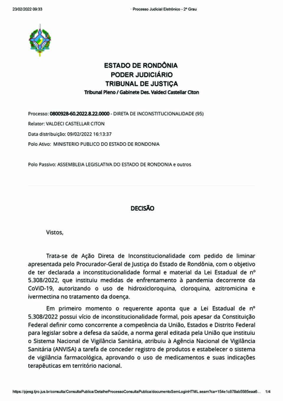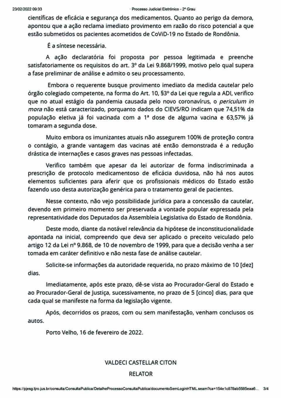“Segundo o requerente [MP/RO], ao aprovar a norma em debate, inobservando a existência de múltiplos medicamentos específicos para a COVID-19, o parlamento estadual atentou contra os princípios do interesse público e razoabilidade, expondo a população a risco desnecessário, o qual atentaria contra a dignidade humana, prevista na Declaração Universal sobre Bioética e Direitos Humanos”, diz trecho da síntese das alegações do órgão de fiscalização na decisão.
