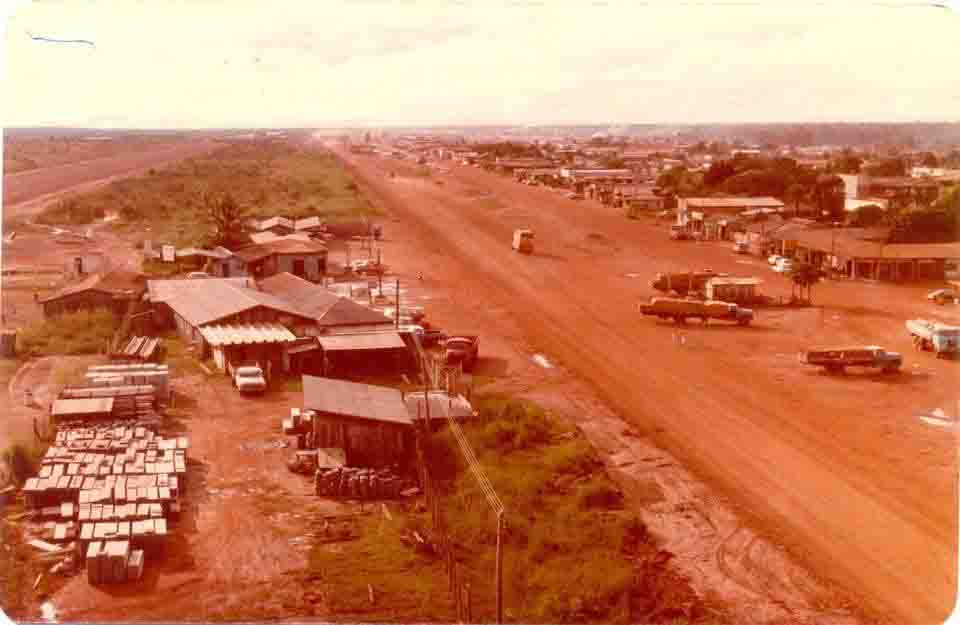 Vilhena, 1976 dividida em duas, à direita a cidade que estava se formando, ao meio a rodovia BR-364 ainda sem asfalto, o que aconteceria só 8 anos depois. Foto provavelmente no verão, porque o piso da via está seco, apesar de não aparecer o poeiral constante no alto verão. À esquerda a pista de asfalto da Empresa TASA – Telecomunicações da Aeronáutica S.A., onde um grupamento da FAB controlava o tráfego de aviões na região, local onde pousavam pequenos aviões. Àquela altura Vilhena ainda distrito de Porto Velho – a emancipação aconteceria só em novembro de 1977, por onde passavam todos que vinham pela BR em busca de uma oportunidade em Rondônia.