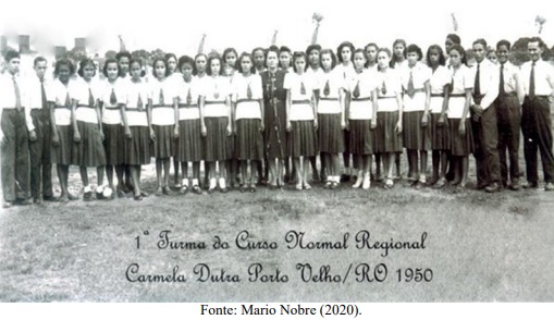 Todos devidamente uniformizados, a primeira turma de alunos do Curso Regional Normal da Escola “Carmela Dutra”, criado em 1947 pelo governador Frederico Trotta, incentivado pela esposa professora Ludmila Trota. Eram professores: Marise Castiel, Português, 1ª série; Floripes Carvalho, Corte e Costura,1ª a 3ª série; Ma. do Carmo Ribeiro, Trabalhos Manuais, idem; Clea Bringel Guerra, Ed. Física, idem; Henrique Fiorani, Canto Orfeânico, idem; José Bezerra Duarte, Português/Geografia; Enos Eduardo Lins, Matemática (1ª) e Português (2ª); Ernesto Almeida, Ciências Naturais 1ª e 2ª séries; Carlos Sales Vieira, Desenho, (idem); Osório Serra, História Geral, 3ª série; José Otino de Freitas, Desenho, 3ª; Ary T. Pena Pinheiro, Anatomia/Matemática, 3ª série. Conforme alguns dos professores que ouvi, a maioria eram voluntários. (Jornal Alto Madeira 8.4.1949)