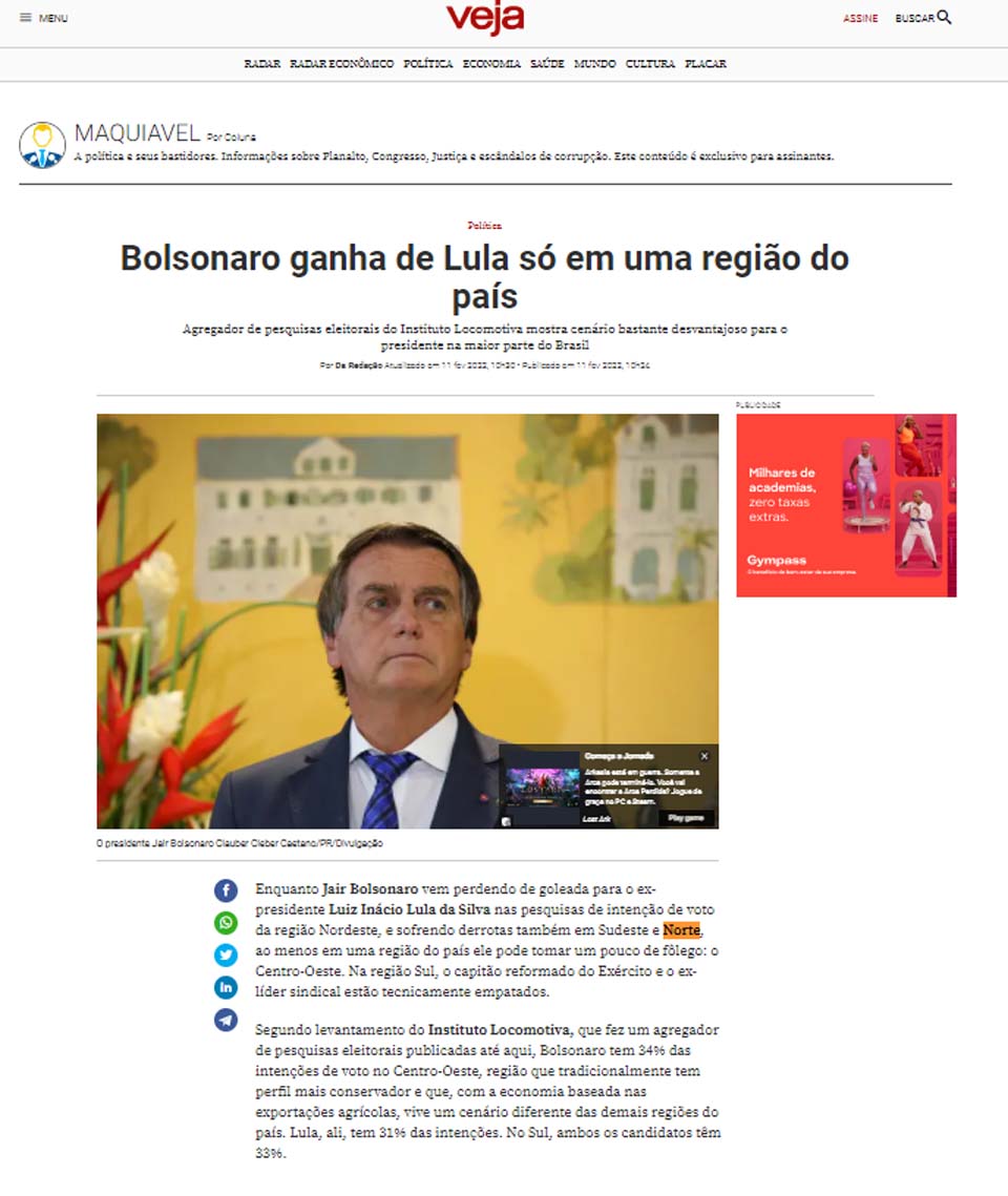 O informação é baseada no agregador de pesquisas eleitorais do Instituto Locomotiva mostrando “cenário bastante desvantajoso para o presidente na maior parte do Brasil”, diz a matéria.