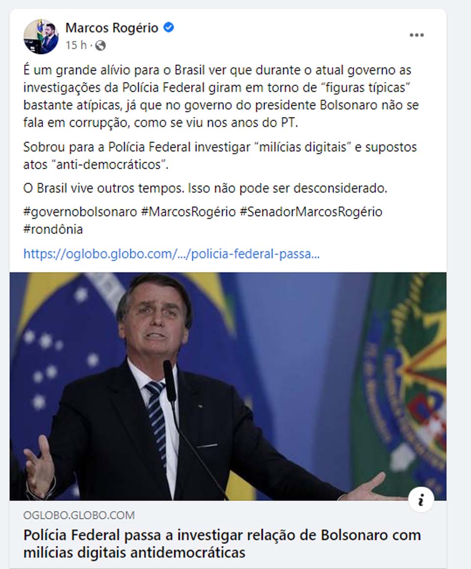 Porto Velho, RO – De maneira velada, o senador de Rondônia Marcos Rogério, do PL, criticou a Polícia Federal (PF) por investigação deflagrada contra o presidente da República Jair Bolsonaro, do mesmo partido do congressista.