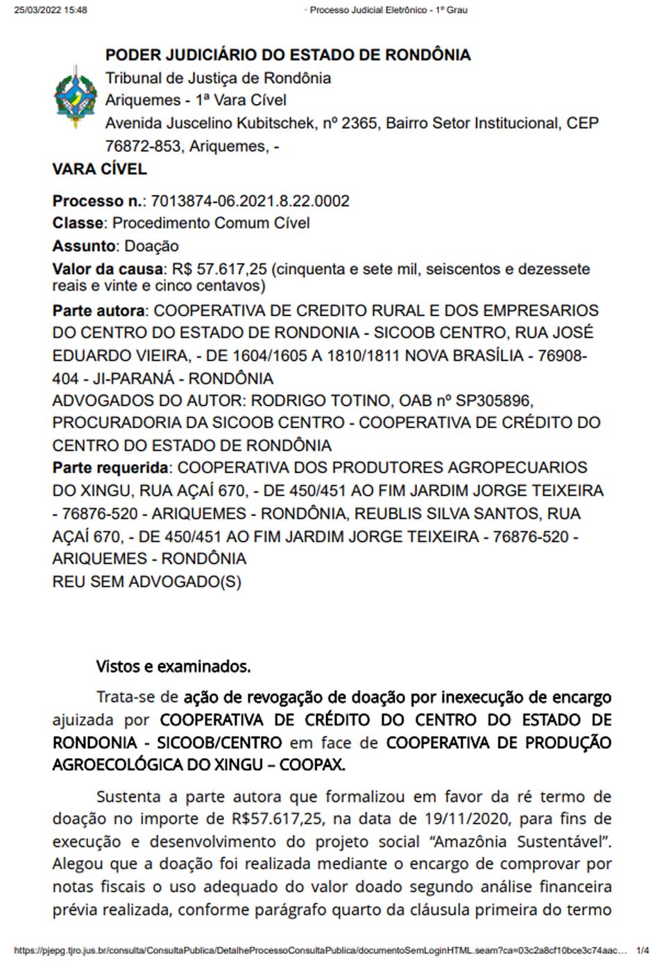 Porto Velho, RO – A juíza de Direito Deisy Cristhian Lorena de Oliveira Ferraz da 1ª Vara Cível de Ariquemes, condenou a Cooperativa de Produção Agroecológica do Xingu (COOPAX) após ação movida pela Cooperativa de Crédito do Centro do Estado de Rondônia (SICOOB-Centro).