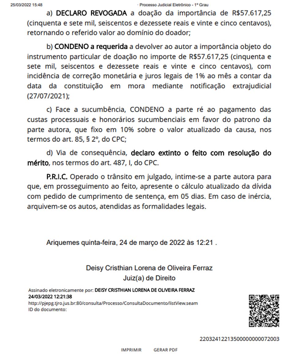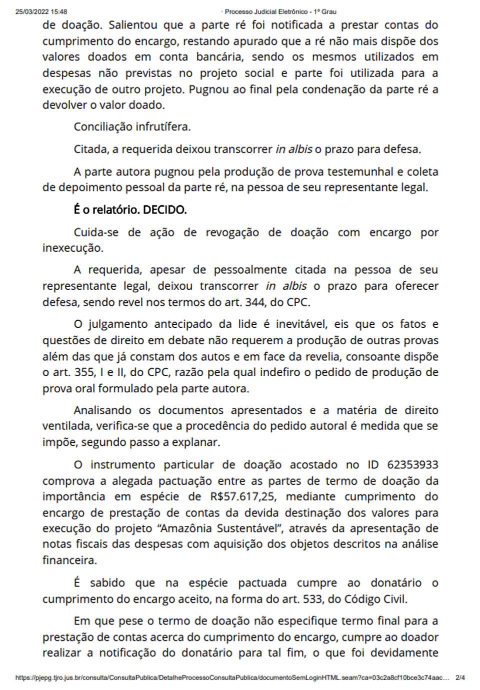 “Os documentos apresentados pelo autor, resultado de prestação de contas e vistoria realizadas administrativamente pelo doador junto ao donatário, demonstram claramente que parte do valor objeto de doação foi gasto com despesas diversas e até particulares, não havendo contraprestação acerca da destinação do restante do valor, comprovando a parte autora que a conta bancária onde foi disponibilizado do valor da doação apresenta um saldo de R$36,22 na data de 02/07/2021, restando demonstrado o efetivo uso do valor doado, sem a devida demonstração do cumprimento do encargo”.