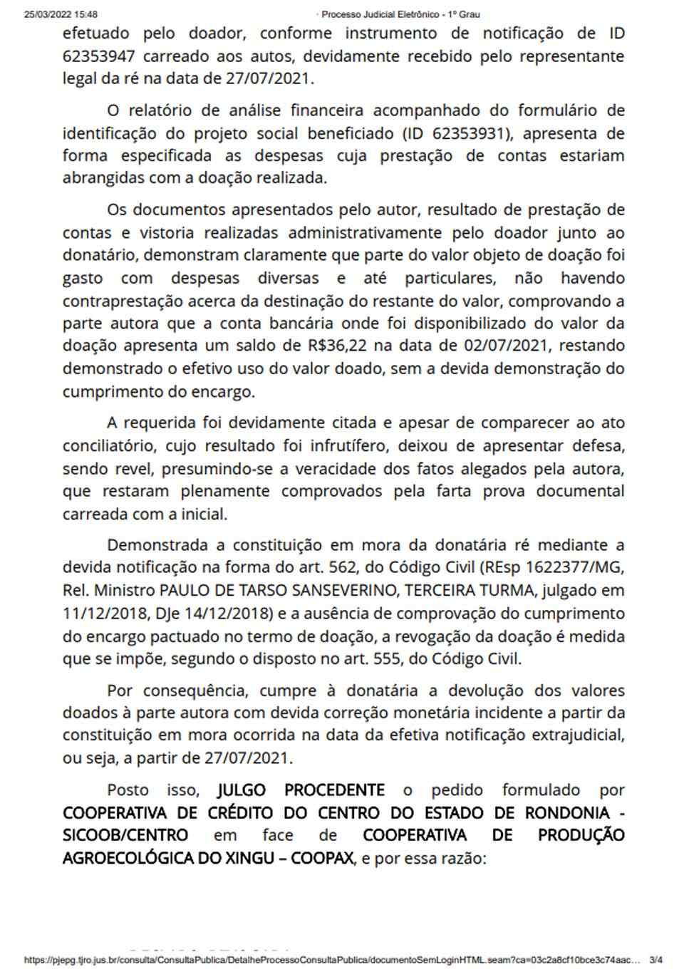 A decisão, portanto, revoga a doação e condena a COOPAX a devolver os R$ 57,6 mil com juros e correção monetária.
