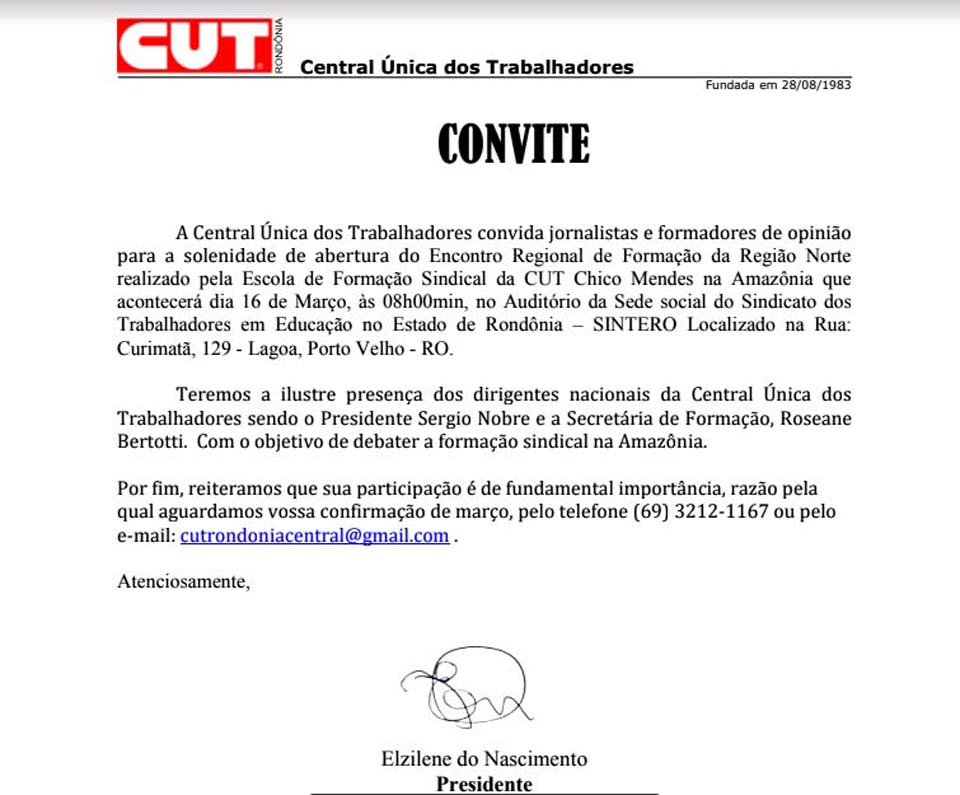 Porto Velho;RO - A Central Única dos Trabalhadores convida jornalistas e todos os meios de comunicação do Estado de Rondônia para participar da solenidade de abertura do Encontro Regional de Formação Sindical da Região Norte que será realizado pela Escola de Formação Sindical da CUT Chico Mendes na Amazonia que acontecerá dia l6 de março, às 08h00min, no Auditório da Sede social do Sindicato dos Trabalhadores em Educação no Estado de Rondônia - SINTERO LOcalizado na Rua: Curimat, 129 - Lagoa, Porto Velho - RO.