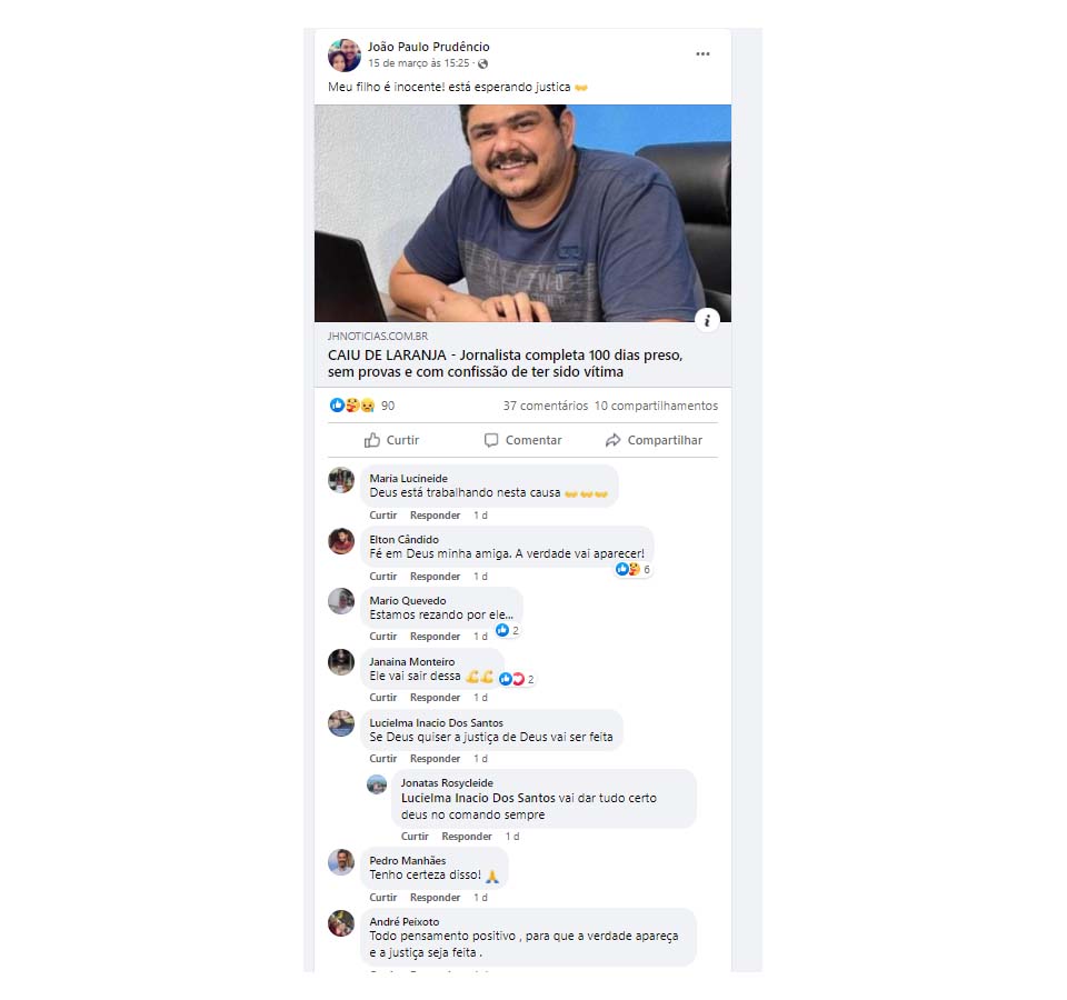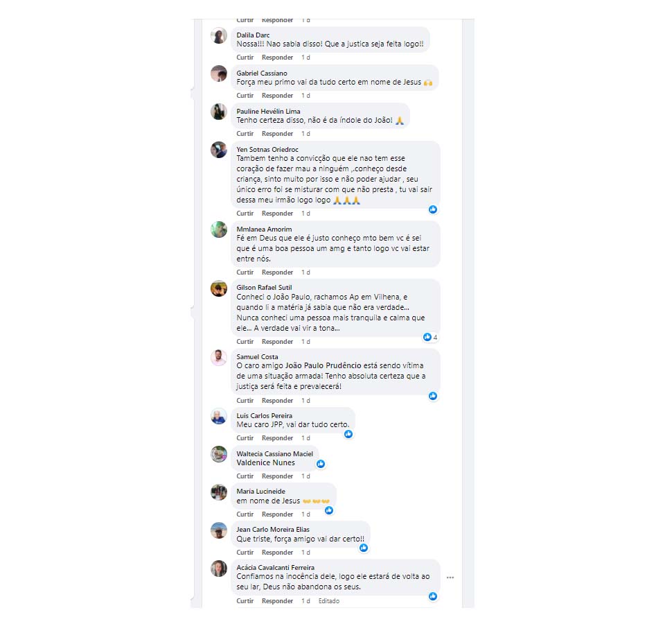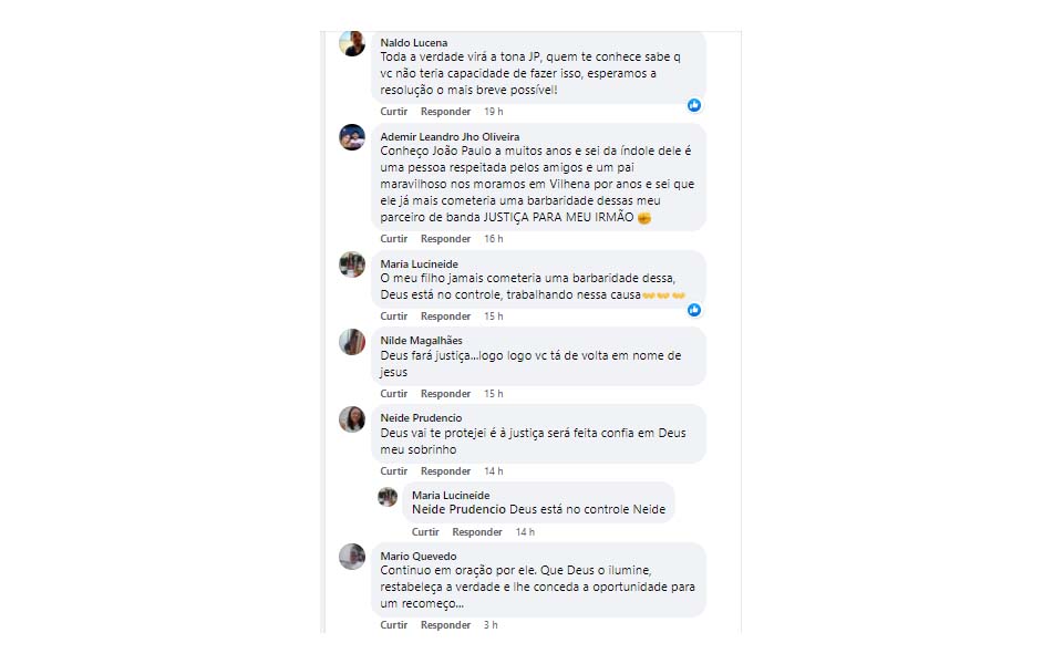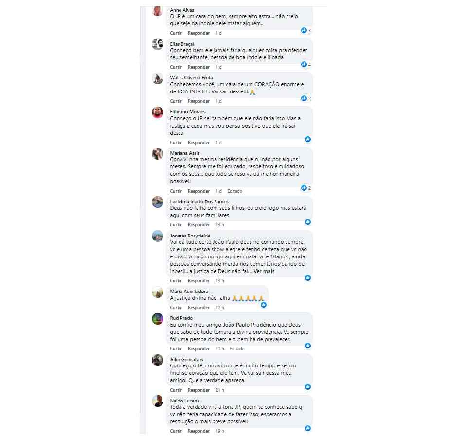 Na postagem, mais de 30 comentários ecoam pedidos de Justiça, mensagens de fé e depoimentos que reforçam a personalidade amena e educada de João Paulo Prudêncio.