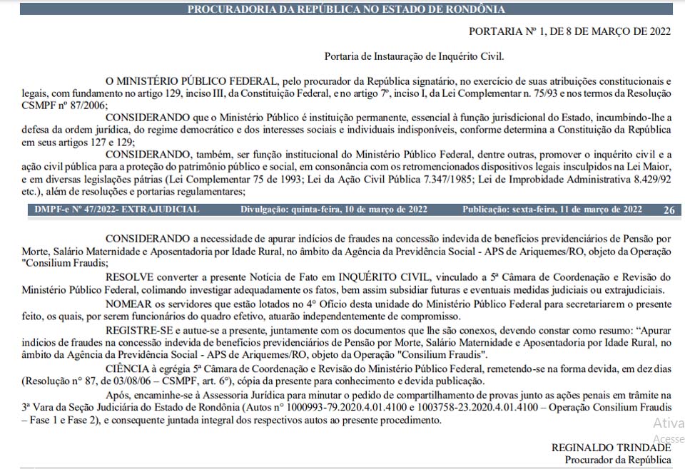 “CONSIDERANDO a necessidade de apurar indícios de fraudes na concessão indevida de benefícios previdenciários de Pensão por Morte, Salário Maternidade e Aposentadoria por Idade Rural, no âmbito da Agência da Previdência Social - APS de Ariquemes/RO, objeto da Operação "Consilium Fraudis”.