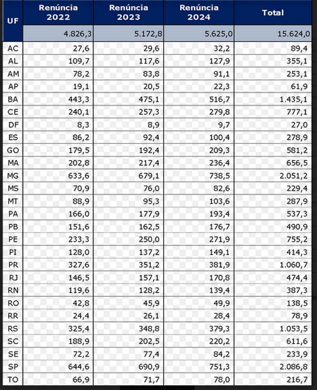 Na tabela a seguir, é possível ver as perdas dos Municípios por Estado.