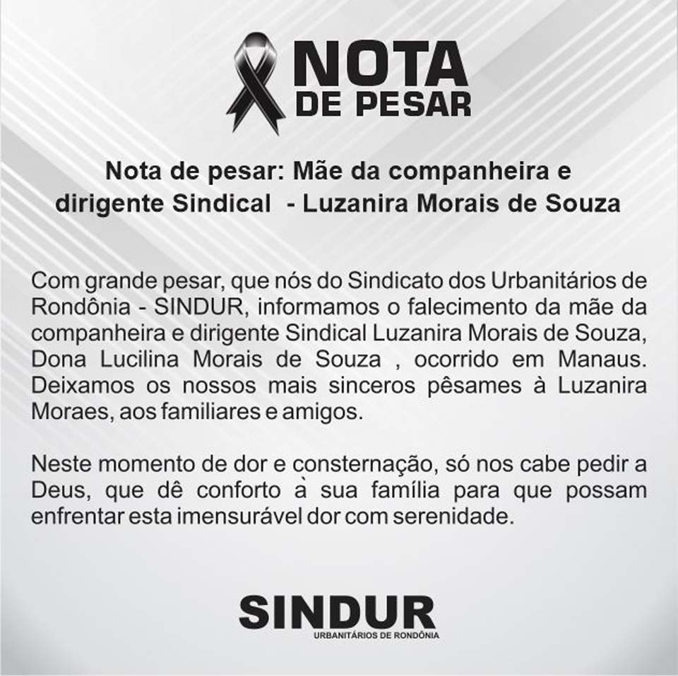 Nota de Pesar SINDUR: Mãe da companheira e dirigente sindical Luzinara Morais de Souza