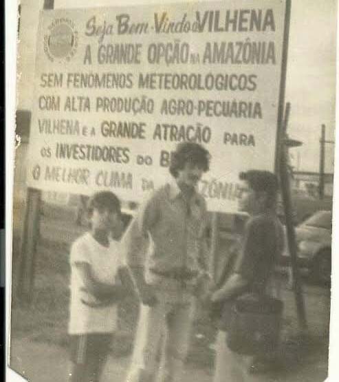 Placa na beira da rodovia BR-364 em Vilhena, fim da década de 1960 a início da de 1970. Em sua primeira passagem pelos sertões no que depois seria a divisa entre os estados de Mato Grosso e Rondônia, Rondon criou um posto telegráfico e o batizou “Vilhena” numa homenagem “ao ex-chefe Álvaro Coutinho de Melo Vilhena, engenheiro chefe da Organização da Carta Telegráfica Pública, que em 1908, foi nomeado pelo Presidente da República, Diretor Geral dos Telégrafos” (ver mais em http://vilhena.ro.gov.br/). A placa, conforme o historiador Júlio Olivar, tinha uma mensagem clara, pois buscava atrair para aquele planalto investidores, numa típica ação de marketing, citava não fenômenos meteorológicos e “o melhor clima da Amazônia”. Em 1977 Vilhena passou à condição de município de Rondônia.