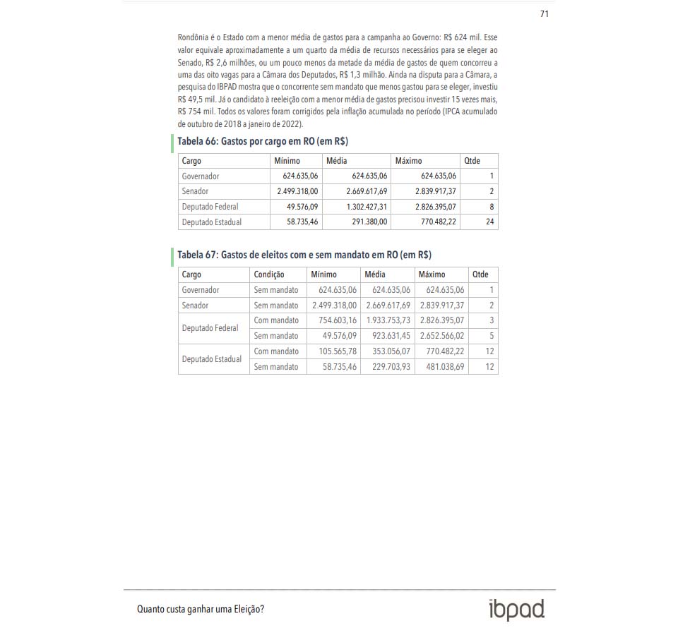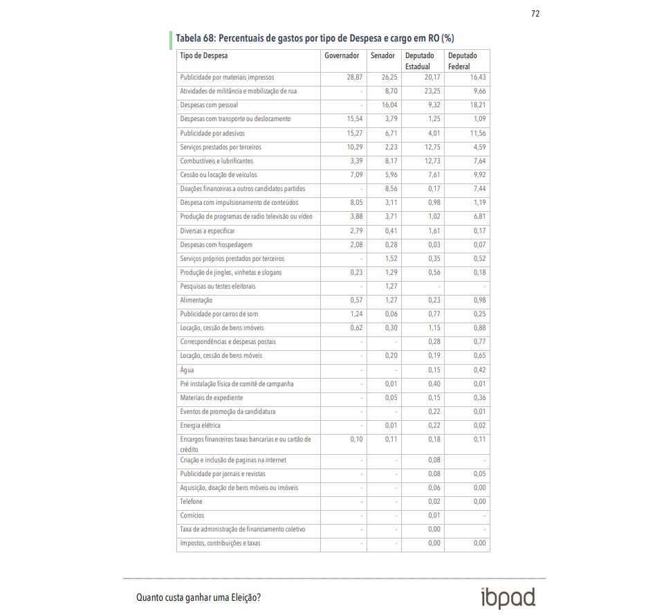 De acordo com o compilado, “Rondônia é o Estado com a menor média de gastos para a campanha ao Governo: R$ 624 mil. Esse valor equivale aproximadamente a um quarto da média de recursos necessários para se eleger ao Senado, R$ 2,6 milhões, ou um pouco menos da metade da média de gastos de quem concorreu a uma das oito vagas para a Câmara dos Deputados, R$ 1,3 milhão”, acrescentou.