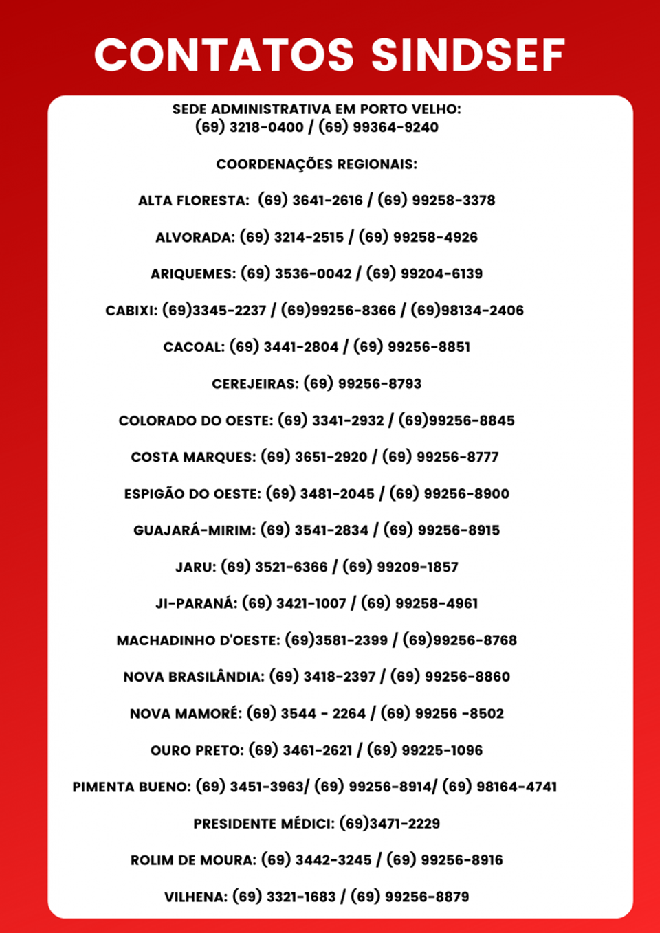 O Sindicato dos Servidores Públicos Federais no Estado de Rondônia – Sindsef/RO convoca aos servidores beneficiários do processo de 28,86%, constantes na lista abaixo, para entrar em contato ou comparecer a uma das Coordenações Regionais ou Sede Administrativa do sindicato em Porto Velho, o mais urgente possível, de forma a sanar pendências no processo, que tem como patrono o Escritório Fonseca & Assis.