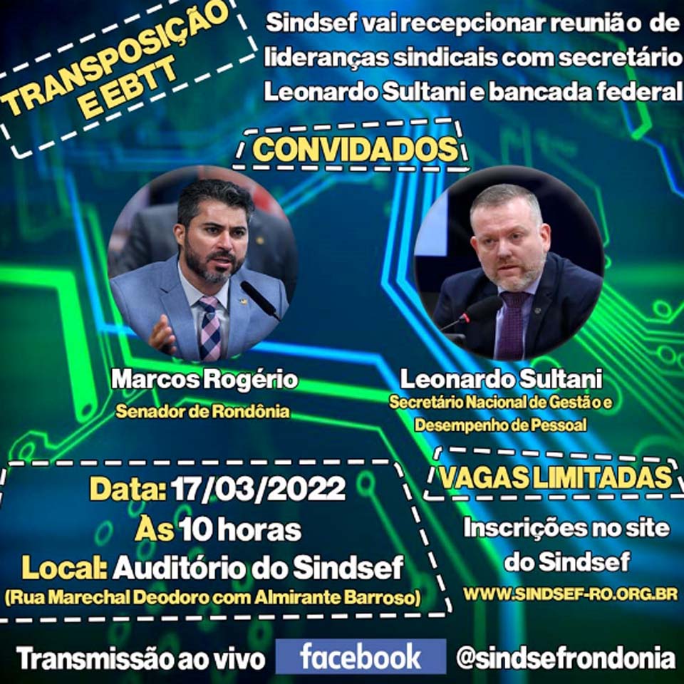 Nesta quinta-feira, dia 17 de março, o Sindicato dos Servidores Públicos Federais no Estado de Rondônia – Sindsef/RO vai recepcionar a reunião das lideranças sindicais de Rondônia com o secretário de Gestão e Desempenho de Pessoal, Leonardo Sultani, senador Marcos Rogério e demais parlamentares da bancada federal.