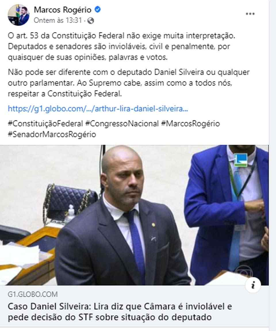 “A situação do deputado Daniel Silveira constrange a todos nós do parlamento. A inviolabilidade da Casa do Povo deve ser preservada. Ninguém está acima da Constituição Federal!”, anotou.