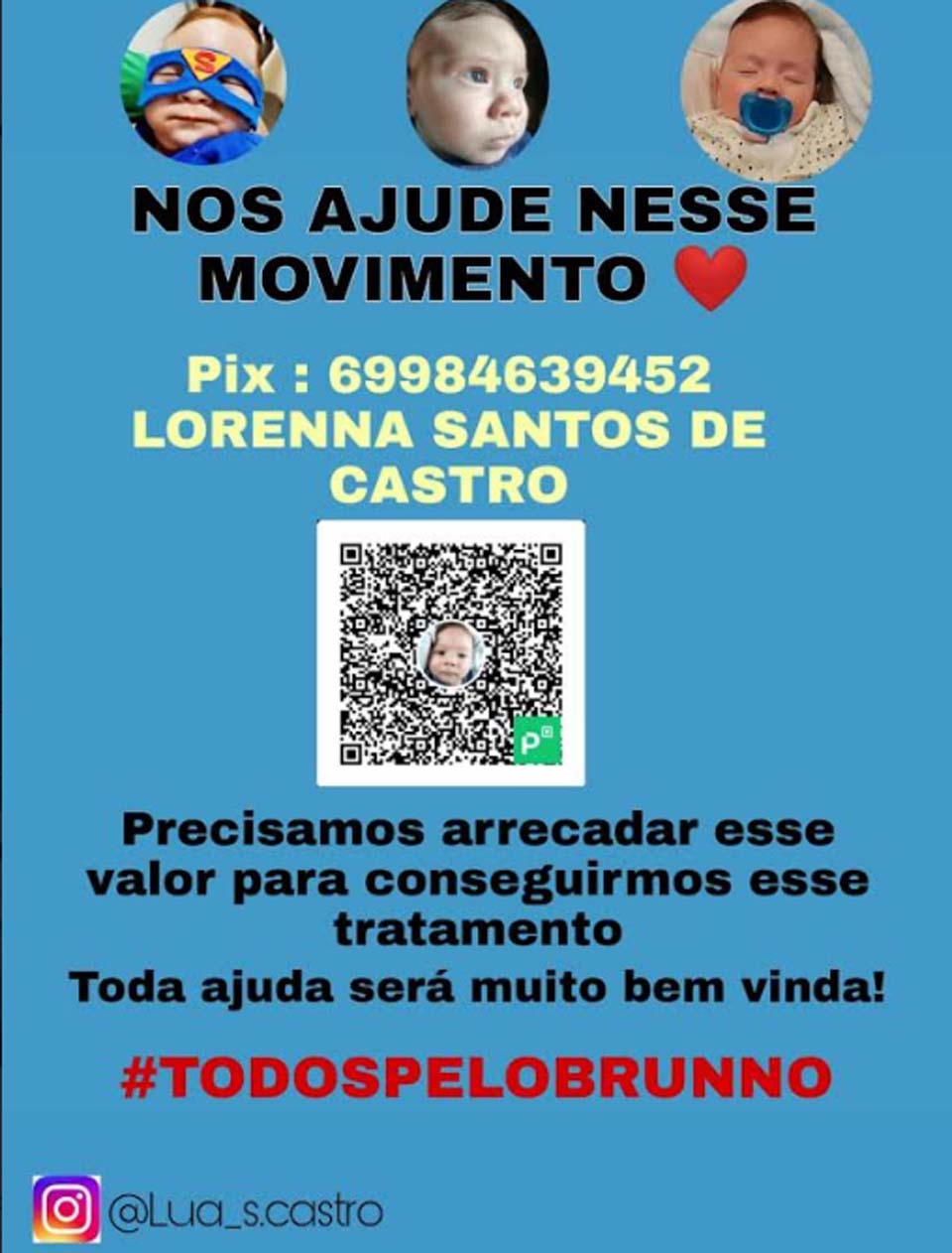 As doações podem ser realizadas via PIX: 69 984639452 (celular) em nome de Lorenna Santos de Castro, mãe de Brunno.