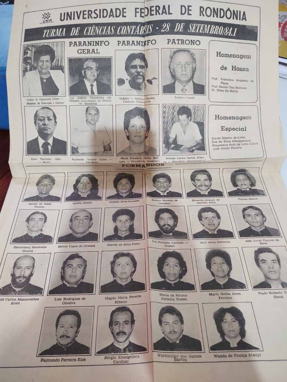 1984 – Primeira turma de Ciências Contábeis da UNIR, tendo como, tendo como paraninfos o governador Jorge Teixeira e o professor Haroldo Cristóvão Teixeira Leite e como patrono o empresário Frederico Camelo. Concluíram o curso 22 estudantes, sendo 15 homens e 9 mulheres. O orador foi o bacharel Ivo Cardoso. O reitor era o professor Euro tourinho Filho. Em realidade só dois dos quatro anos da graduação foram feitos na UNIR, que estava começando suas atividades. Eles iniciaram na Fundacentro, entidade de formação superior criada pelo prefeito Odacir Soares. Historicamente a cobrança de cursos superiores em Porto Velho data do início dos anos 1920, conforme Antônio Cantanhede, em “Achegas para a história de Porto Velho”, mas não surtiu efeitos.