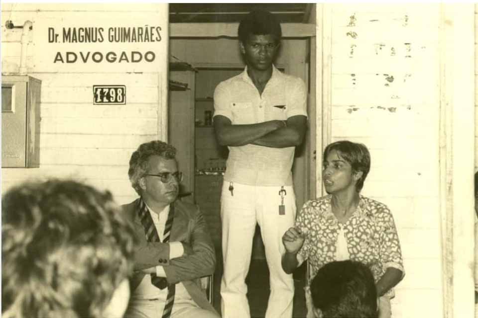Na porta do escritório do seu marido Magnus Magalhães (e), à época presidente da Companhia de Mineração de Rondônia, a então vereadora (1983/1986) Raquel Cândido fala com manifestantes de uma área invadida em Porto Velho. Deputada federal por duas vezes – 1987/91 e 1991/94 foi um dos parlamentares que escreveram a Constituição de 1988 e em 1992 votou pela cassação do presidente Fernando Collor. Em 1994 foi cassada, e prometeu nunca mais retornar a Rondônia. Depois de perder o mandato estabeleceu residência em Brasília. De pé, na porta, o advogado Juscelino Moraes de Amaral, àquela altura assessor da presidência da CMR.