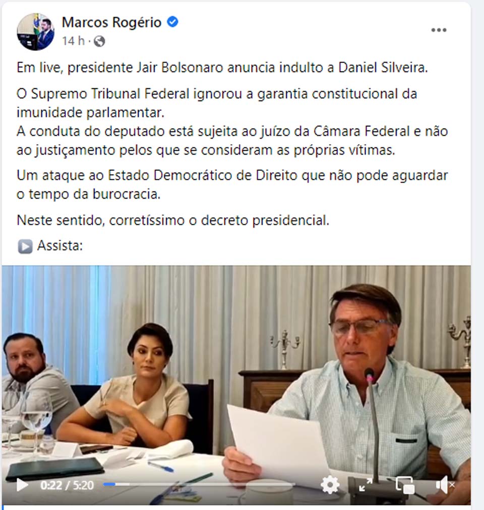 Porto Velho, RO – O senador de Rondônia Marcos Rogério, do PL, correligionário de Jair Bolsonaro, comentou o indulto concedido pelo presidente da República ao deputado federal Daniel Silviera (PTB).